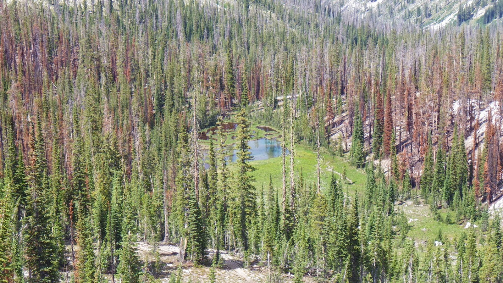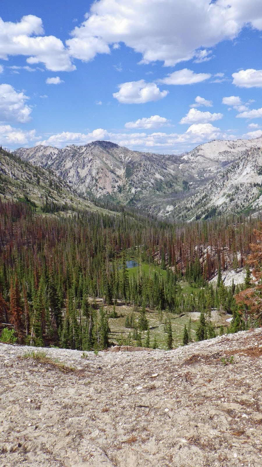 We could see the tarn we were aiming to reach in the valley below, and after Ambrose had a few minutes to rest, we started down the trail. Ambrose led at this point. I’m not as fast going downhill as I am going uphill, so it makes sense for him to lead when we go downhill. Not that I have any trouble keeping up.