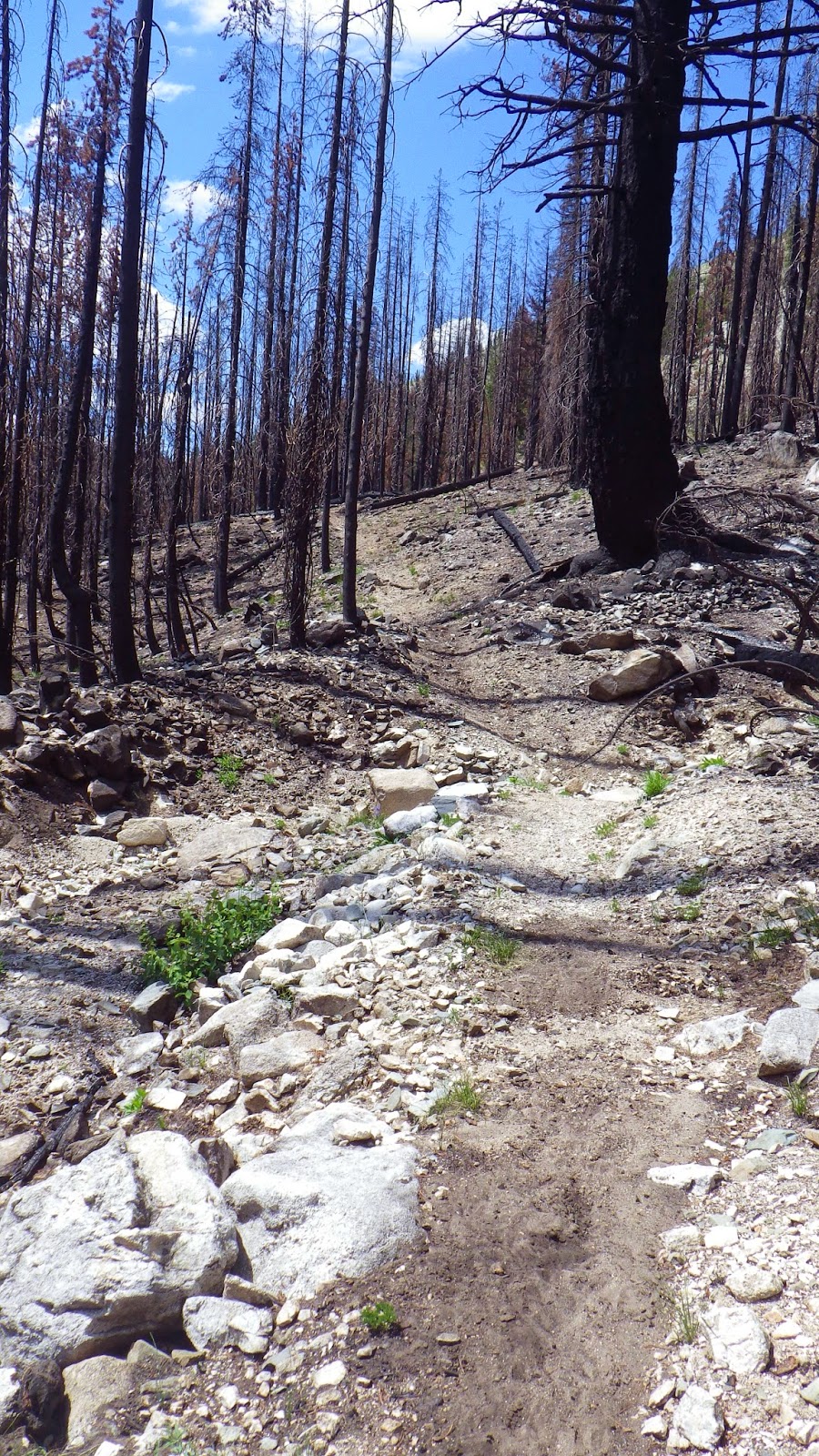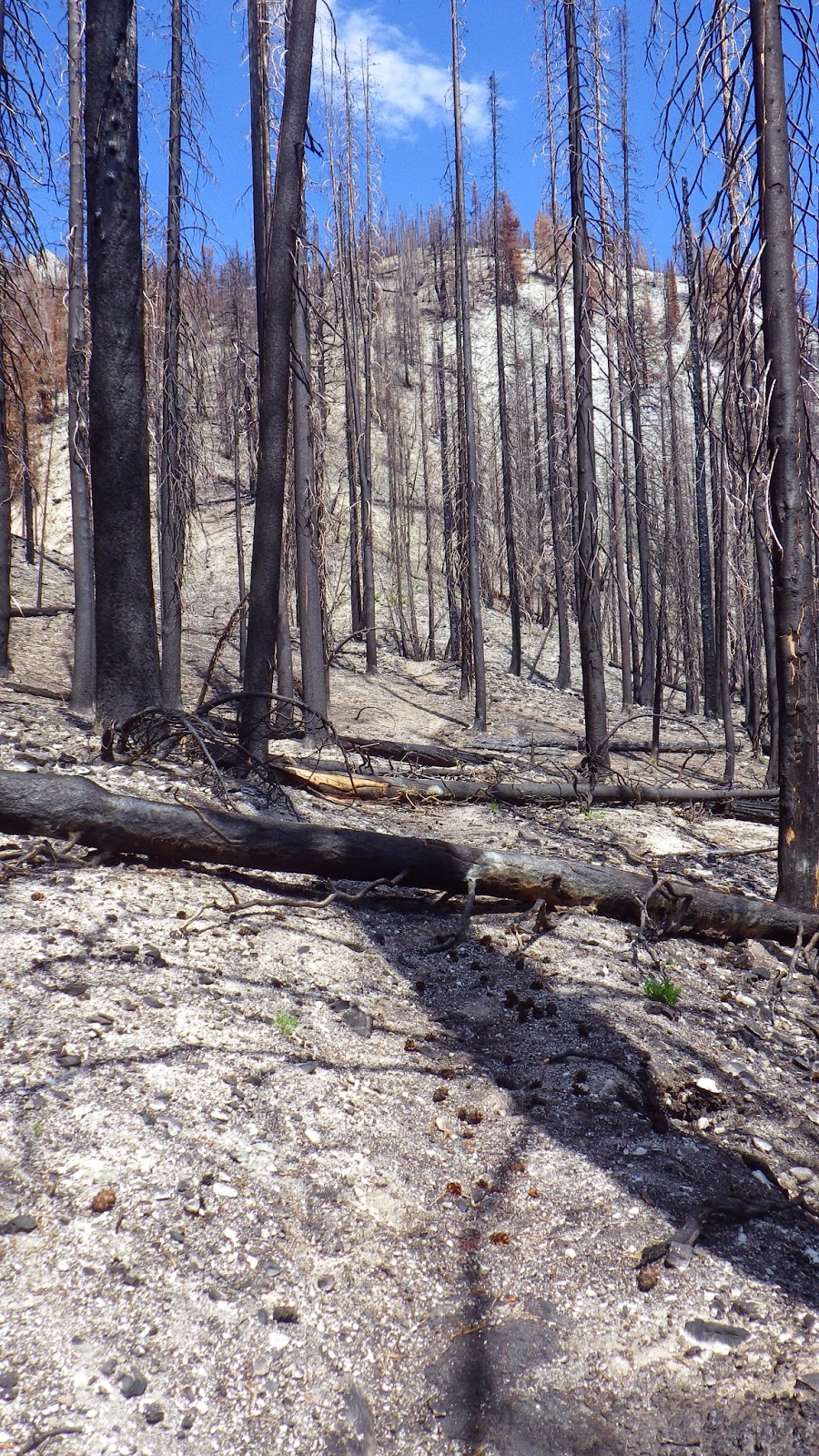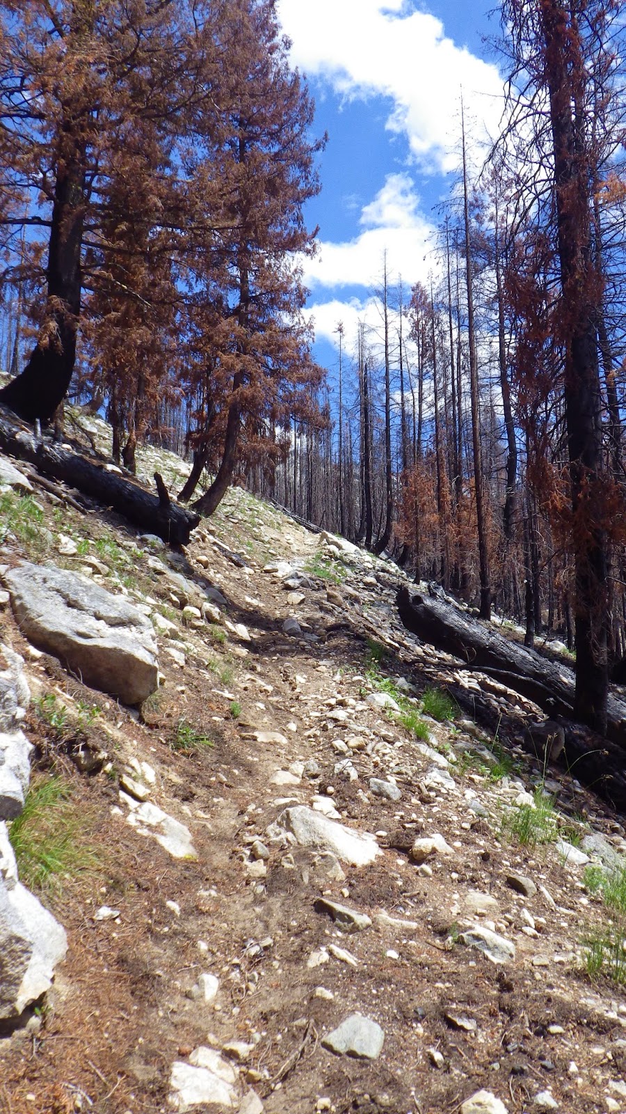 Now we were headed up trail that we had never before walked. We were in the midst of a burned forest and we knew from the map that we were about to hit a zipper of a switchback.