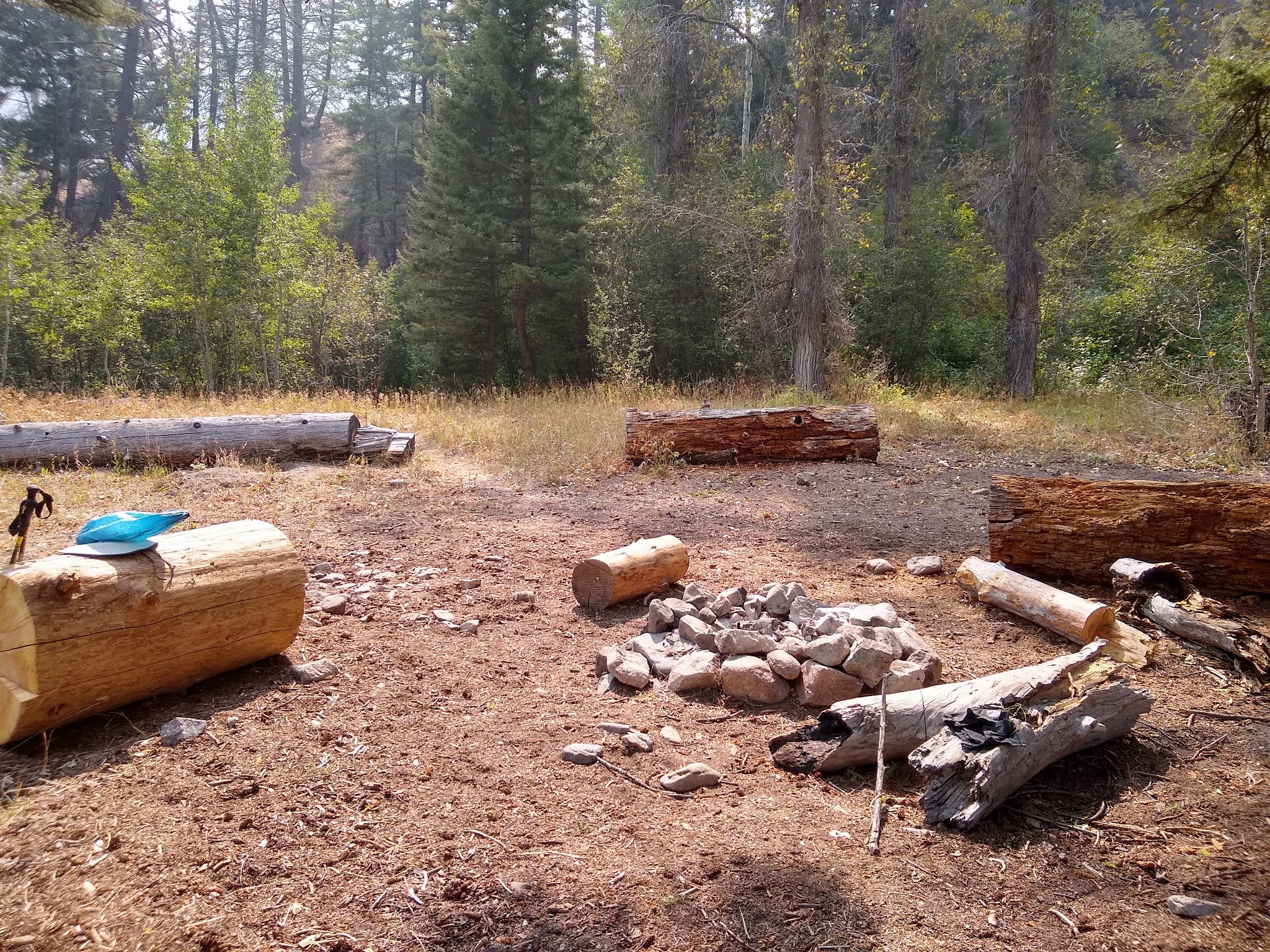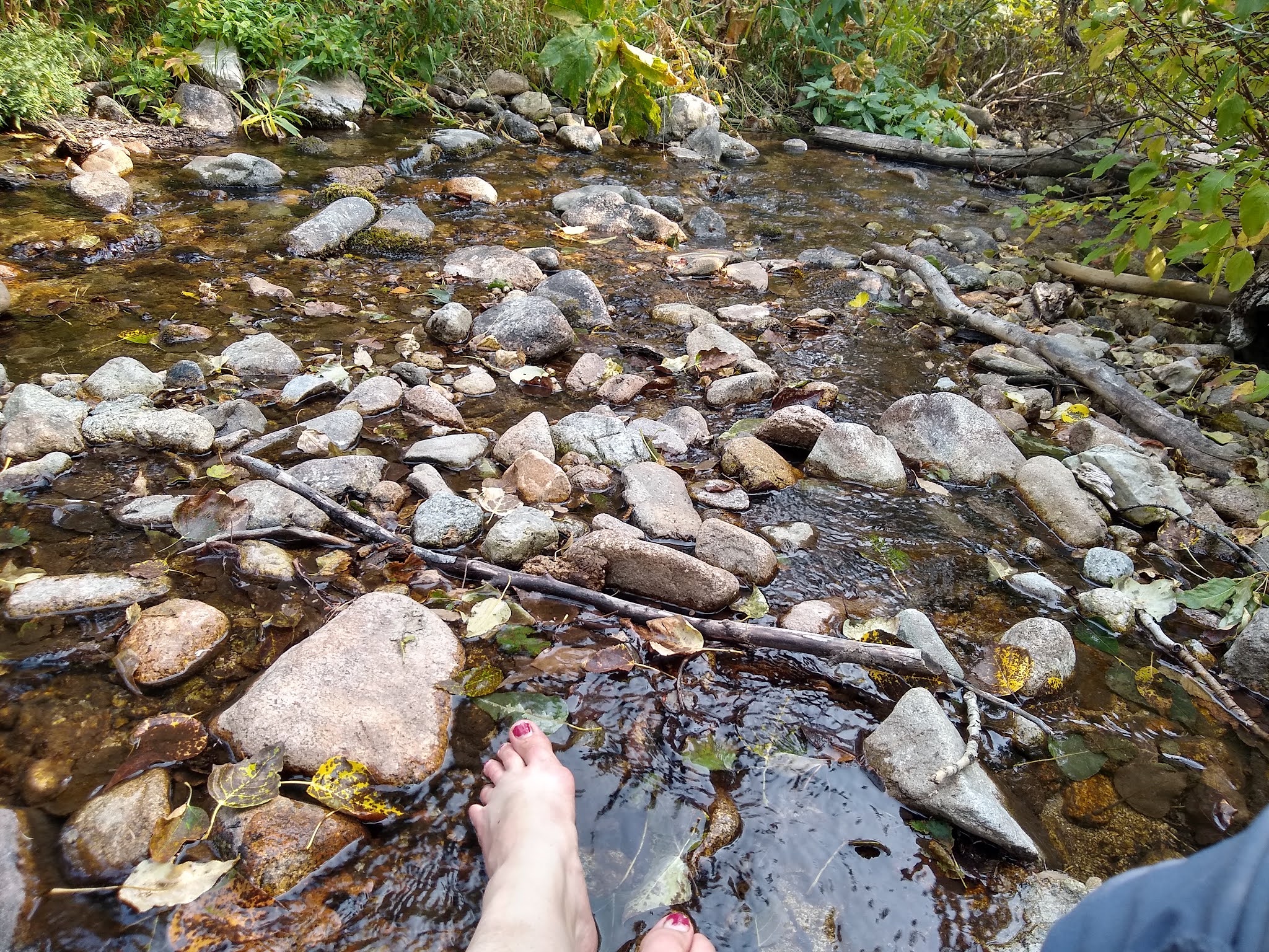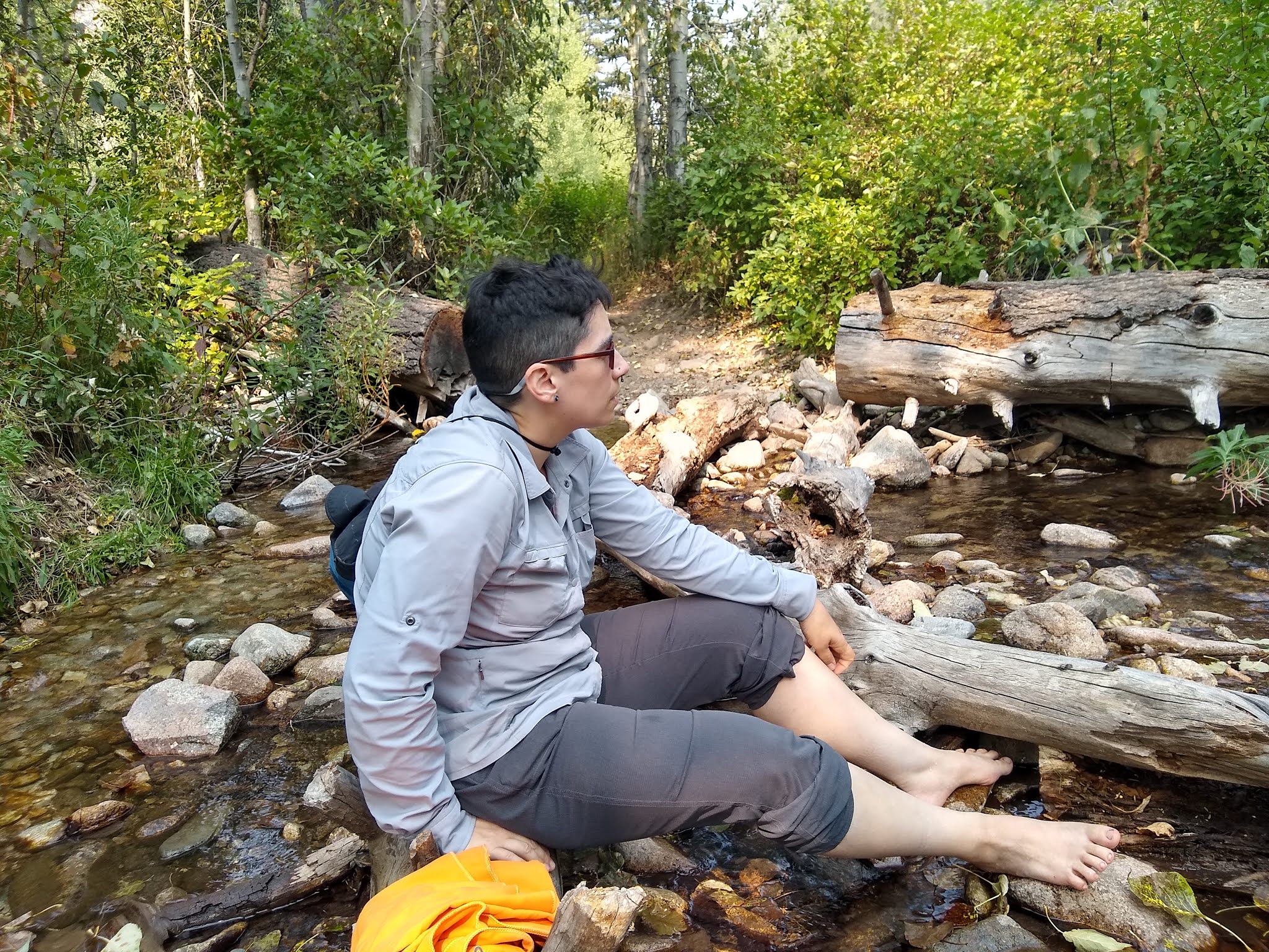 After we’d completed chores, it was still too warm to head to the hot springs. I hadn’t been able to banish the smoky weather, though it wasn’t too bad. So we headed over to where Skillern Creek crosses the trail and sat with our feet in the water and talked. A tiny little fish came by and provided minutes of entertainment with its antics. A couple of motorcycles went by, but we were off the trail enough that we didn’t need to move for them.