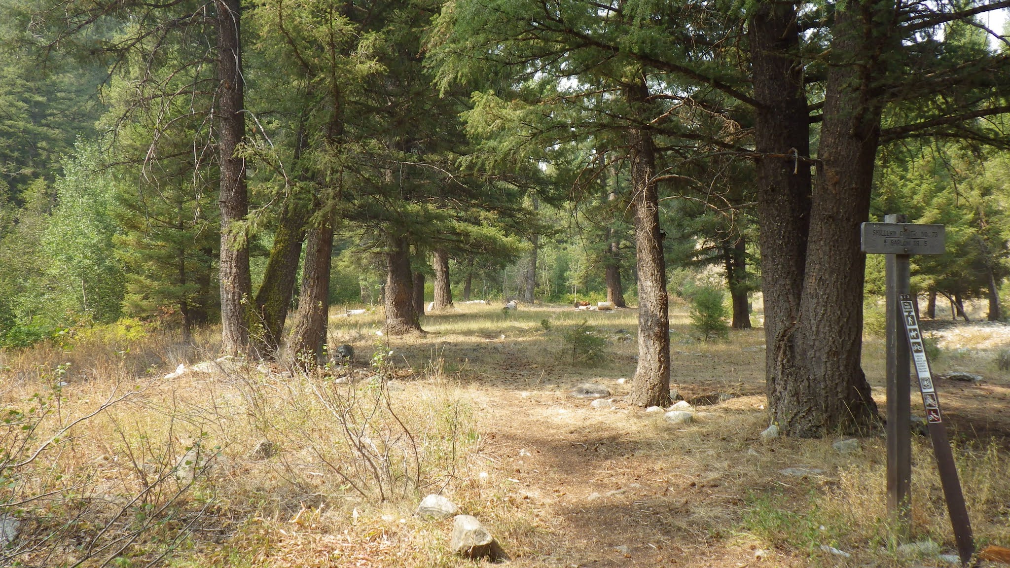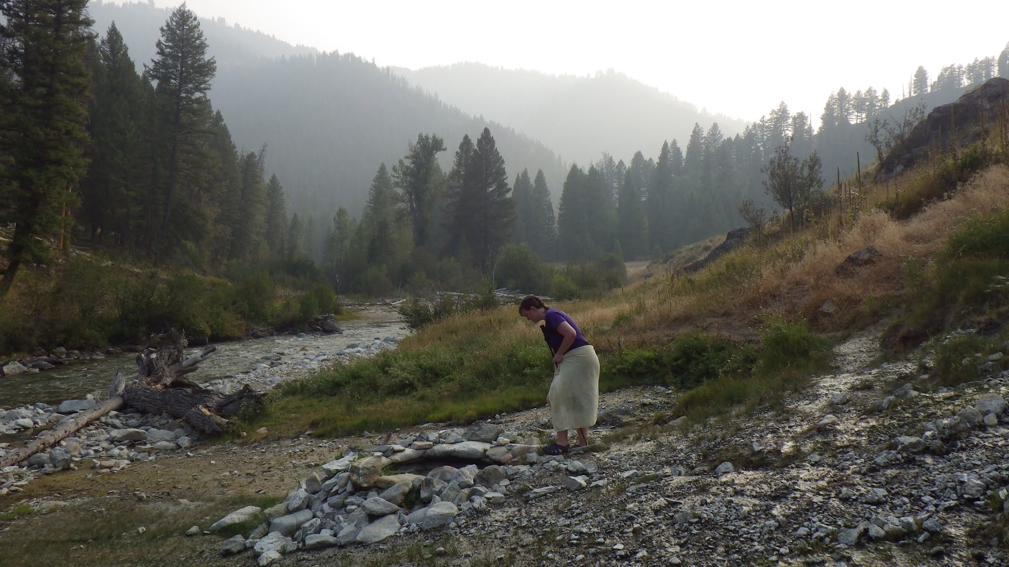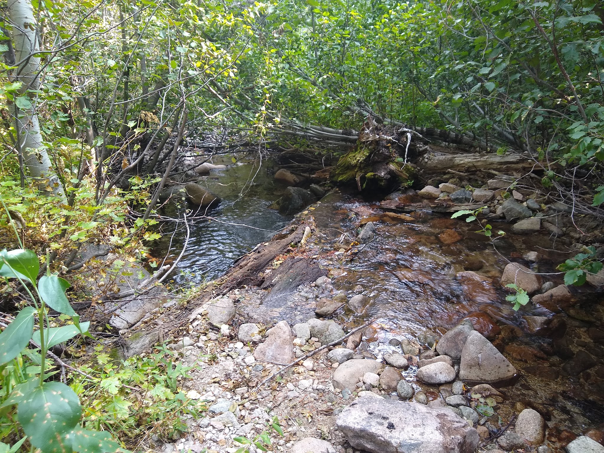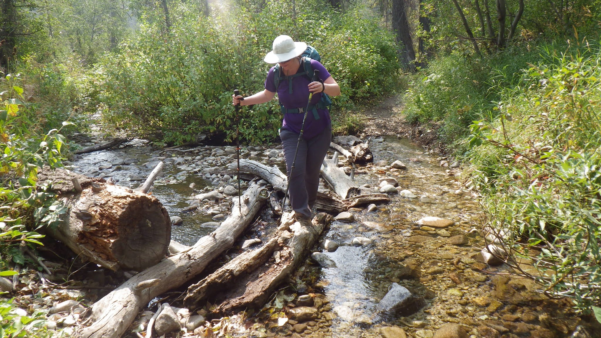After we’d completed chores, it was still too warm to head to the hot springs. I hadn’t been able to banish the smoky weather, though it wasn’t too bad. So we headed over to where Skillern Creek crosses the trail and sat with our feet in the water and talked. A tiny little fish came by and provided minutes of entertainment with its antics. A couple of motorcycles went by, but we were off the trail enough that we didn’t need to move for them.