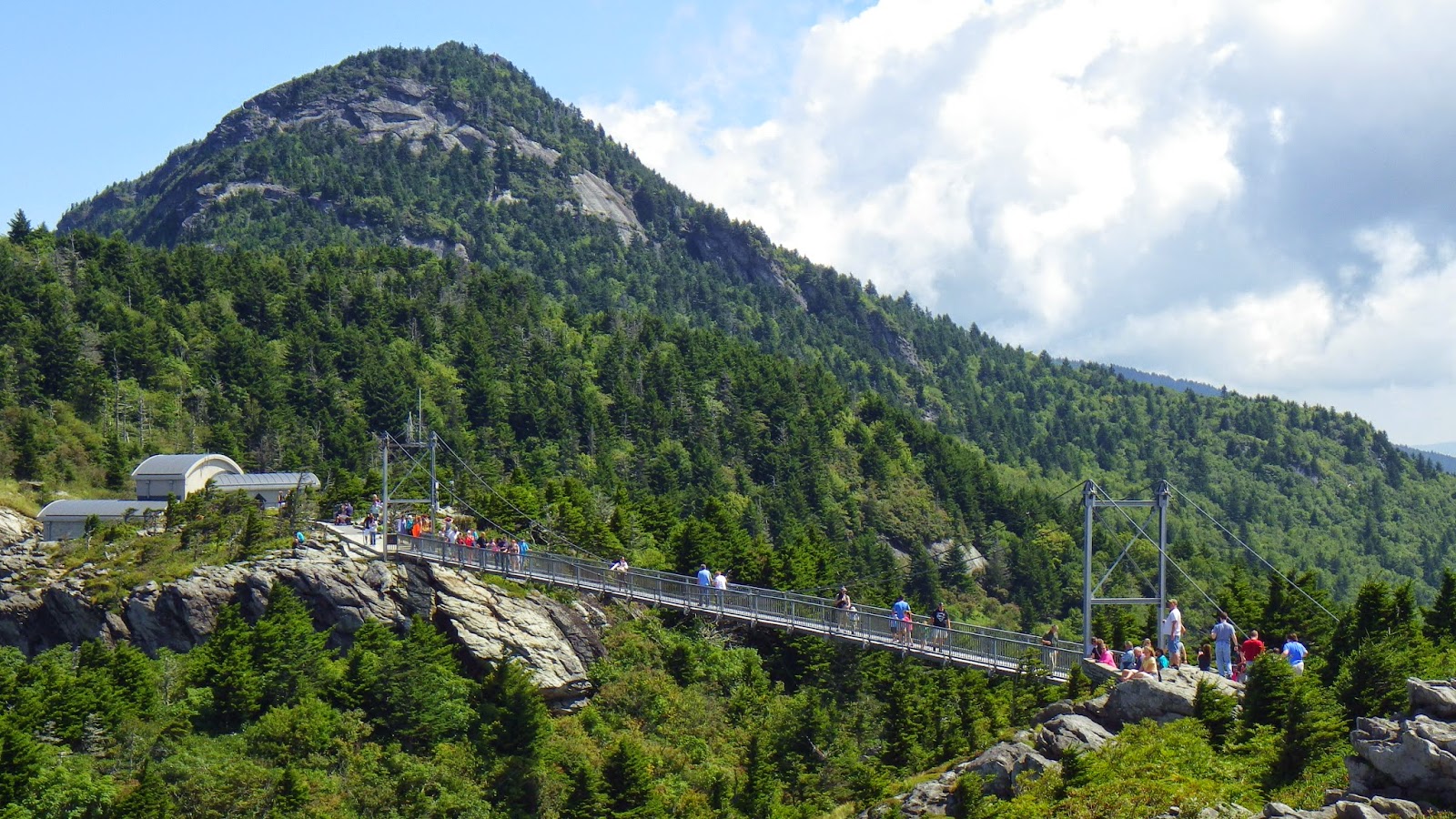 | The swinging bridge, with the peak of Grandfather Mountain in the background. Part of me wanted to climb to the peak, but more of me still felt too carsick. And I didn’t have my hiking boots. |