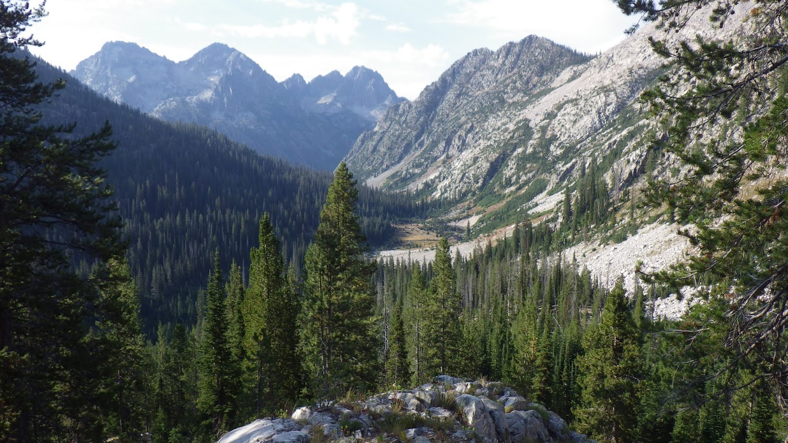 We had some more switchbacks to climb, though they were interspersed with longer stretches of trail that followed the river’s canyon up. I waited for Ambrose just after the next sidestream crossing, which was a hop-over. The next crossing of the Middle Fork was one that I’d done boots off back in 2016, but that was late in the afternoon when I was hot and the water felt nice. This was early morning, with the sun now hidden by clouds. So while I waited for Ambrose to catch up, I found an alternate path that allowed us to cross on some partially submerged logs.