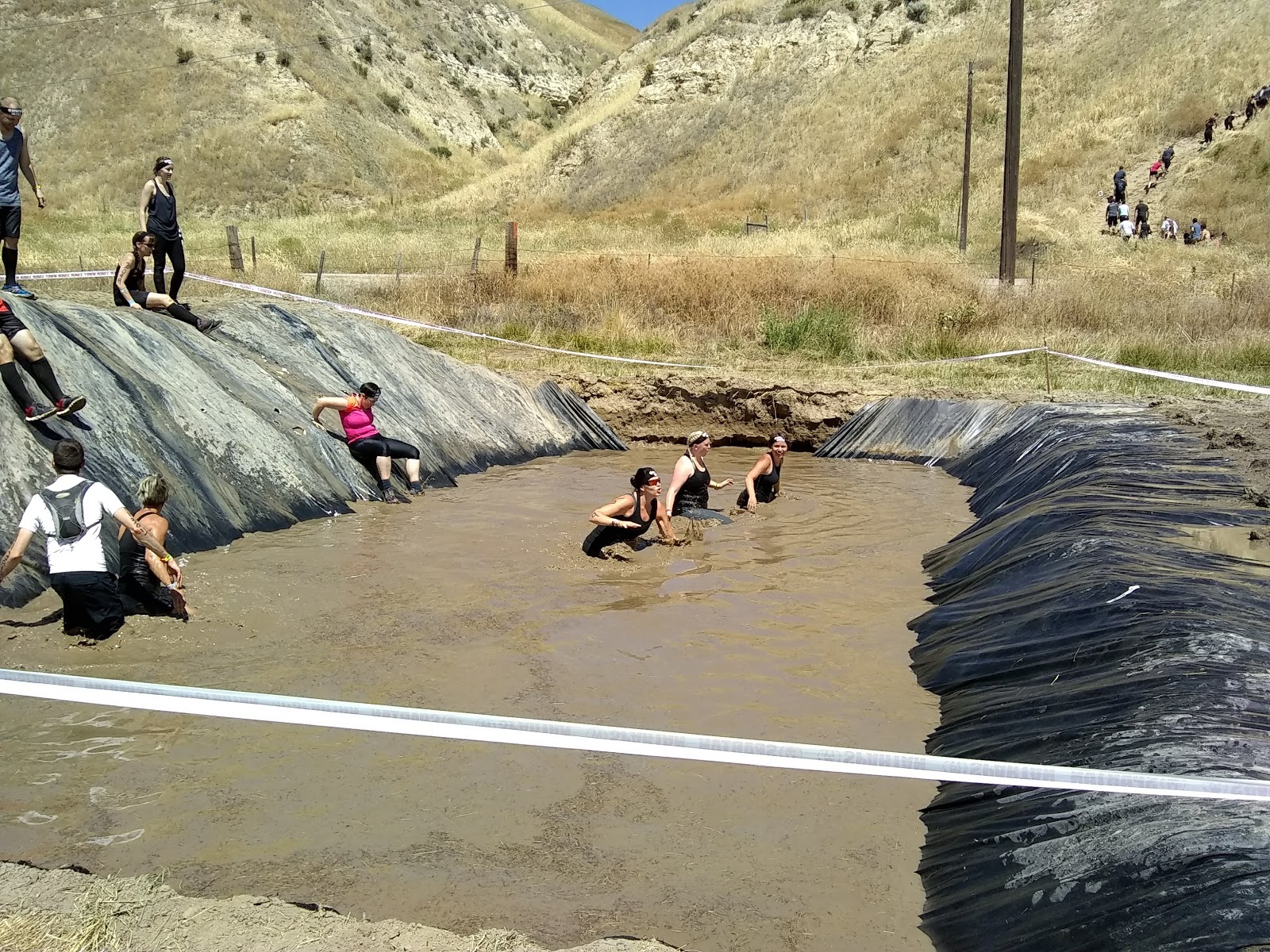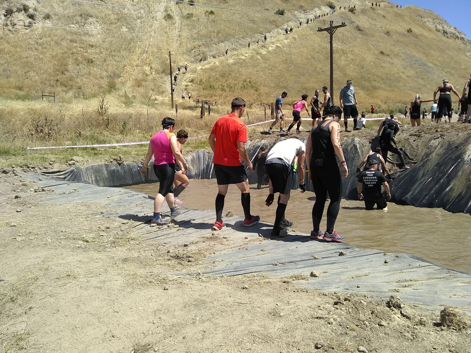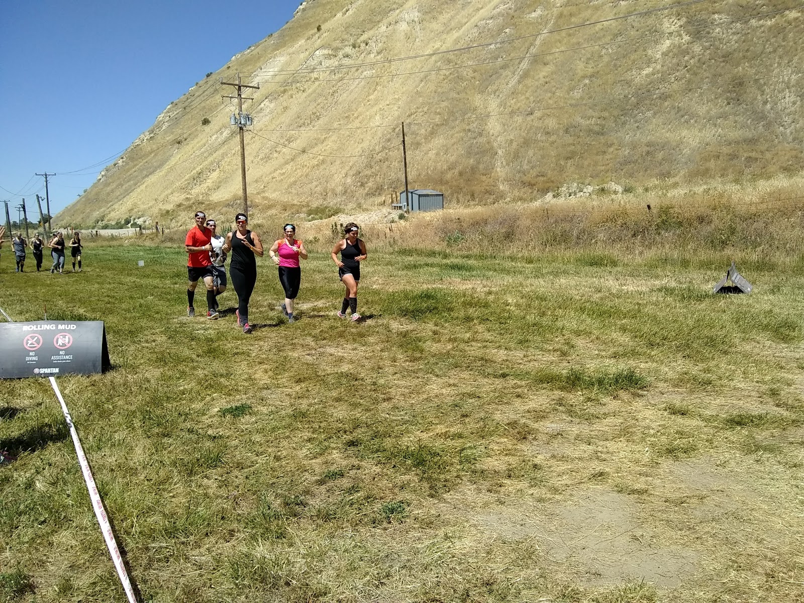 Because although I stood alone in the corral, near the front and ready to go after climbing the wall to enter, I didn’t stay alone for long. I jogged slowly through the rough terrain to the Over Wall, and hopped over that without any trouble. Then I jogged some more to get to the Rolling Mud. Right before the mud, I was found. Someone who had also been to the Camp Rhino training the prior weekend saw me, said hi, and asked if I wanted to join her team. I said yes and was immediately adopted.