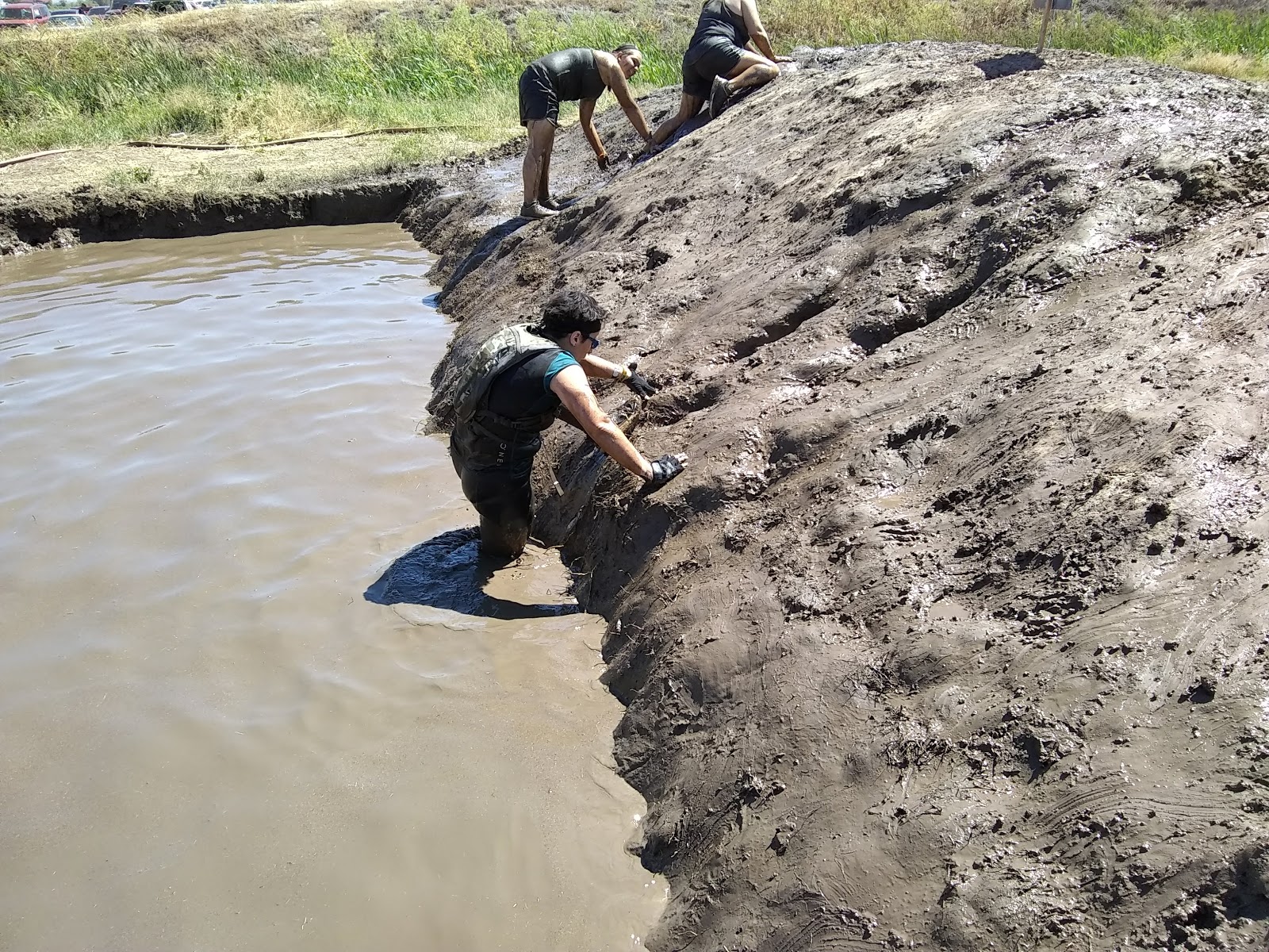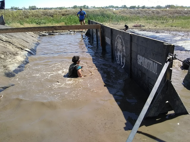 Next was the 7 foot wall. I gave it a try without using the kicker, and although I did manage to grasp at the top of the wall, I couldn’t hold onto it. So onto the kicker I went. From there I was able to get my forearms up, then my ankle. And I was working on scooting my hips closer to my ankle to finish when someone gave me a push. Fine by me. I finished getting up and over and thanked her.