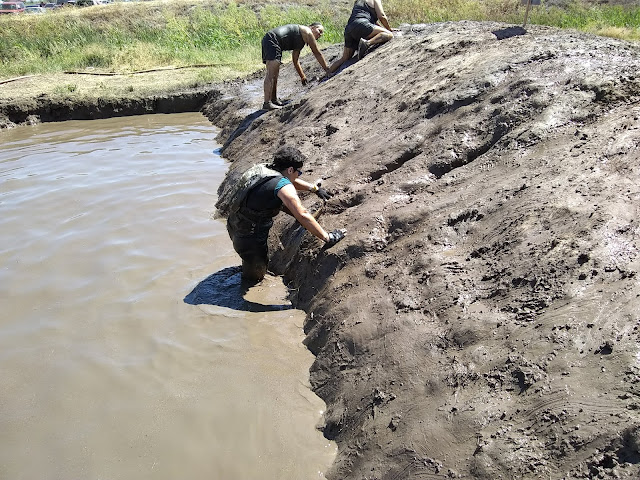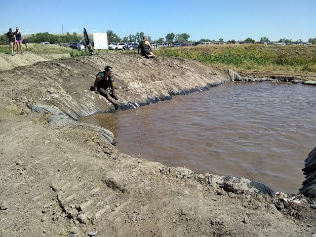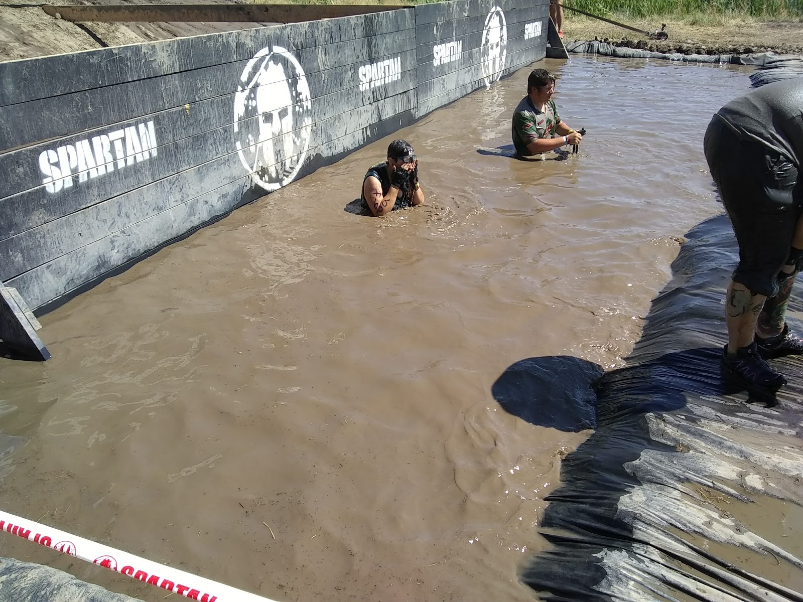 After getting down off the hill was the next obstacle. I kind of thought I might be able to do Olympus, which is a tilted wall that needs to be traversed by a variety of handholds without touching the ground. I had watched a video that advised using the chains so as to keep the feet at a right angle to the wall. I tried that, but my legs were no longer in any shape to do things. I managed to hop myself over about four handholds in and then dropped. 30 more burpees for me.