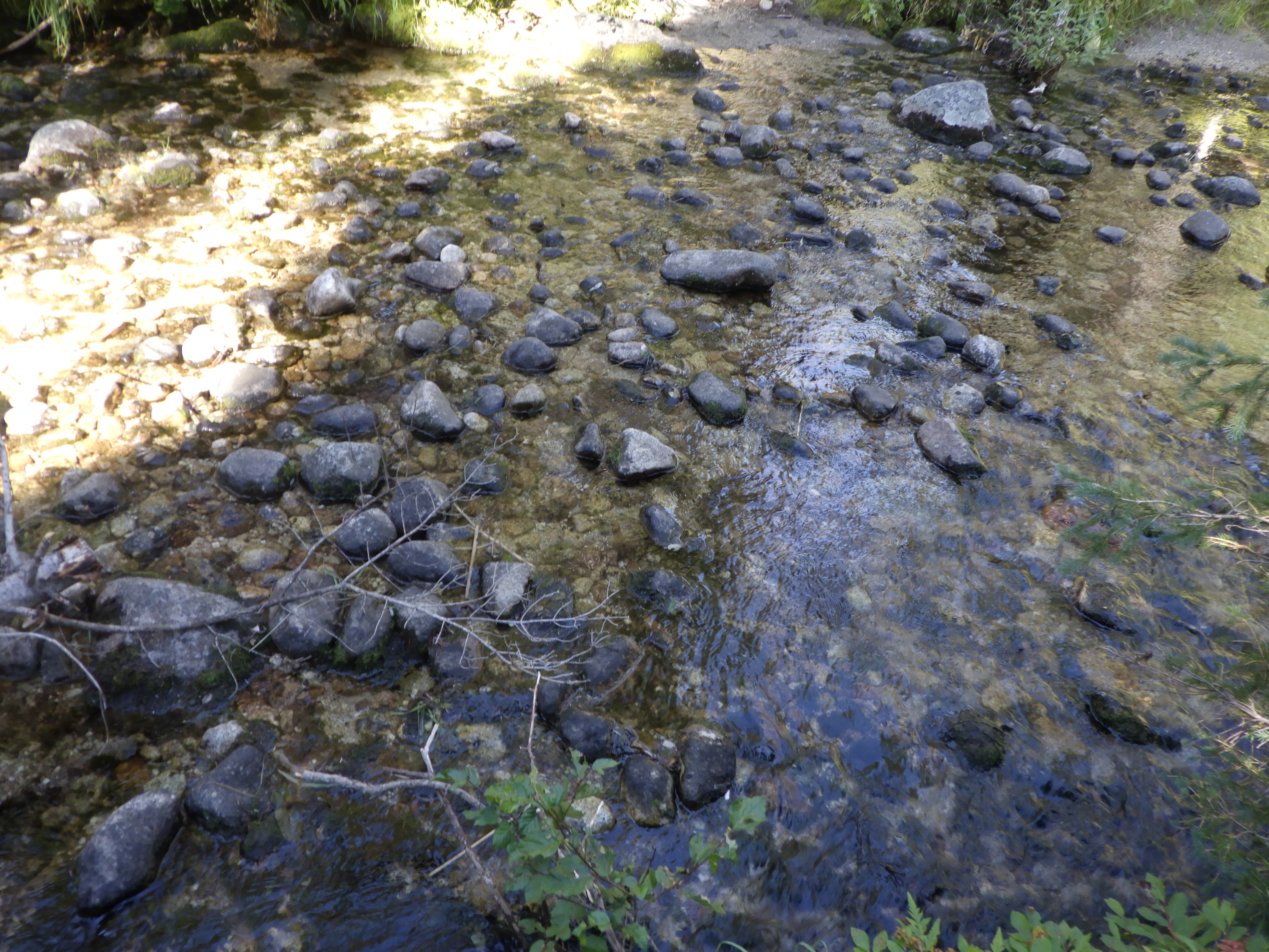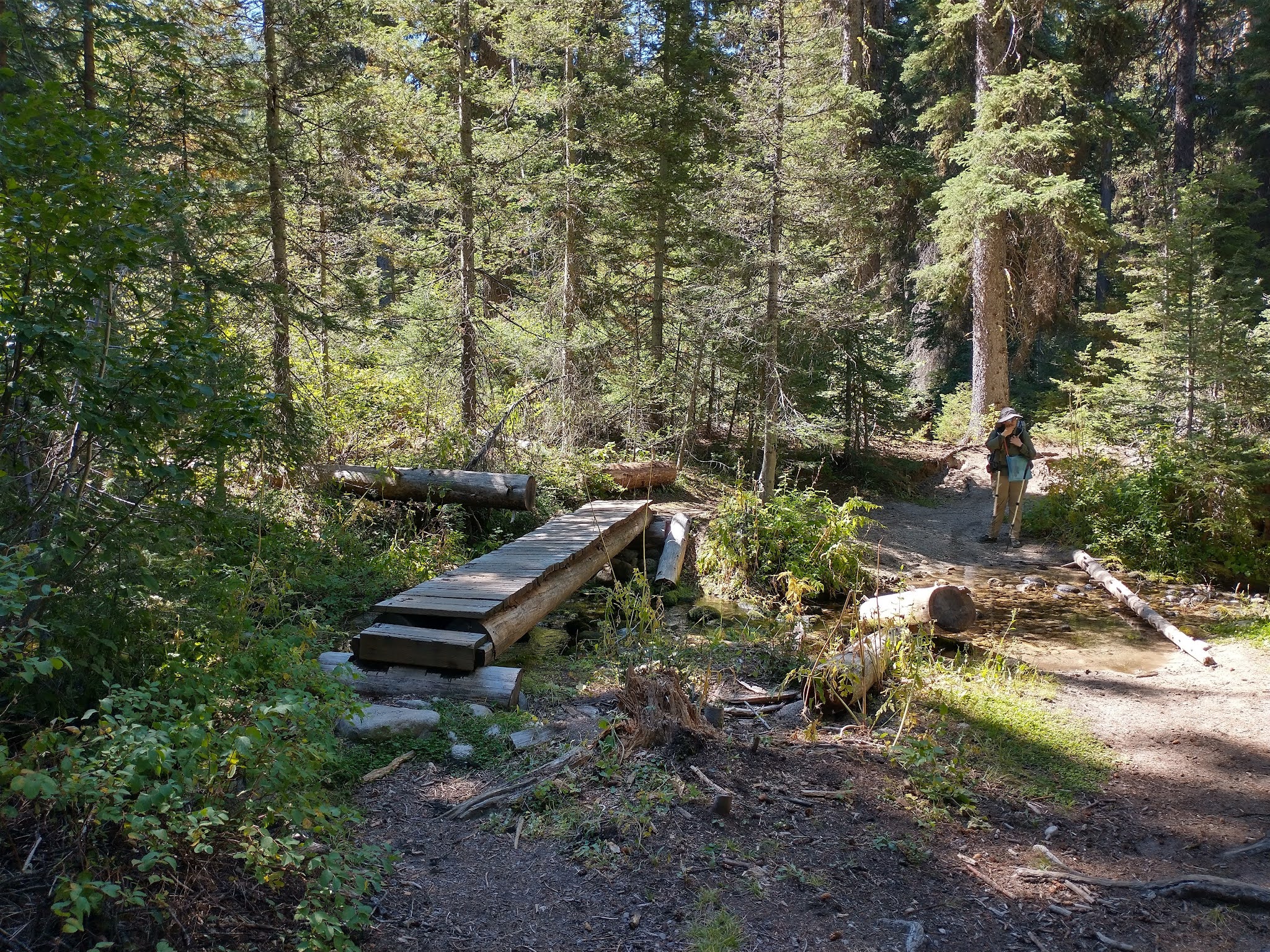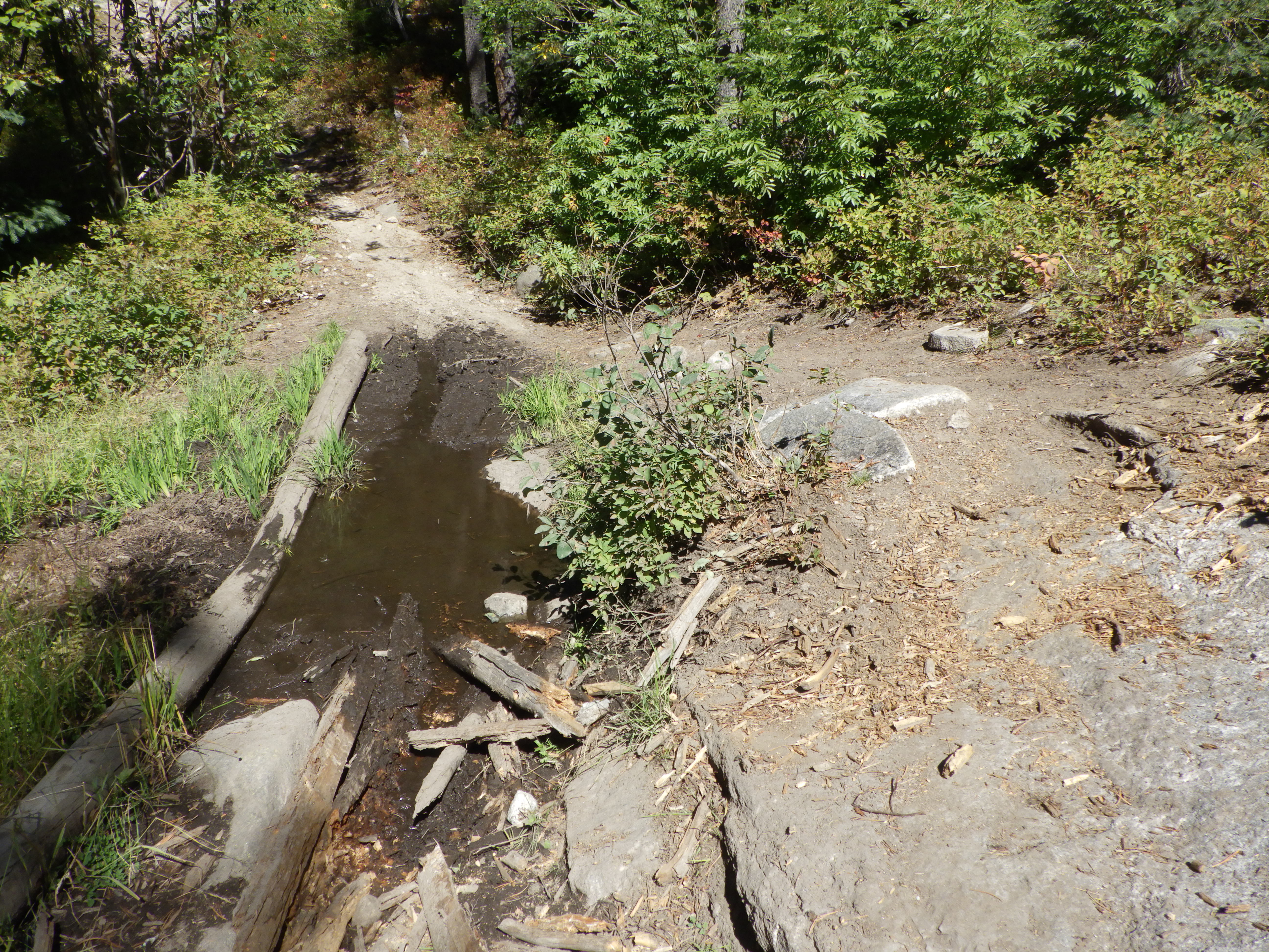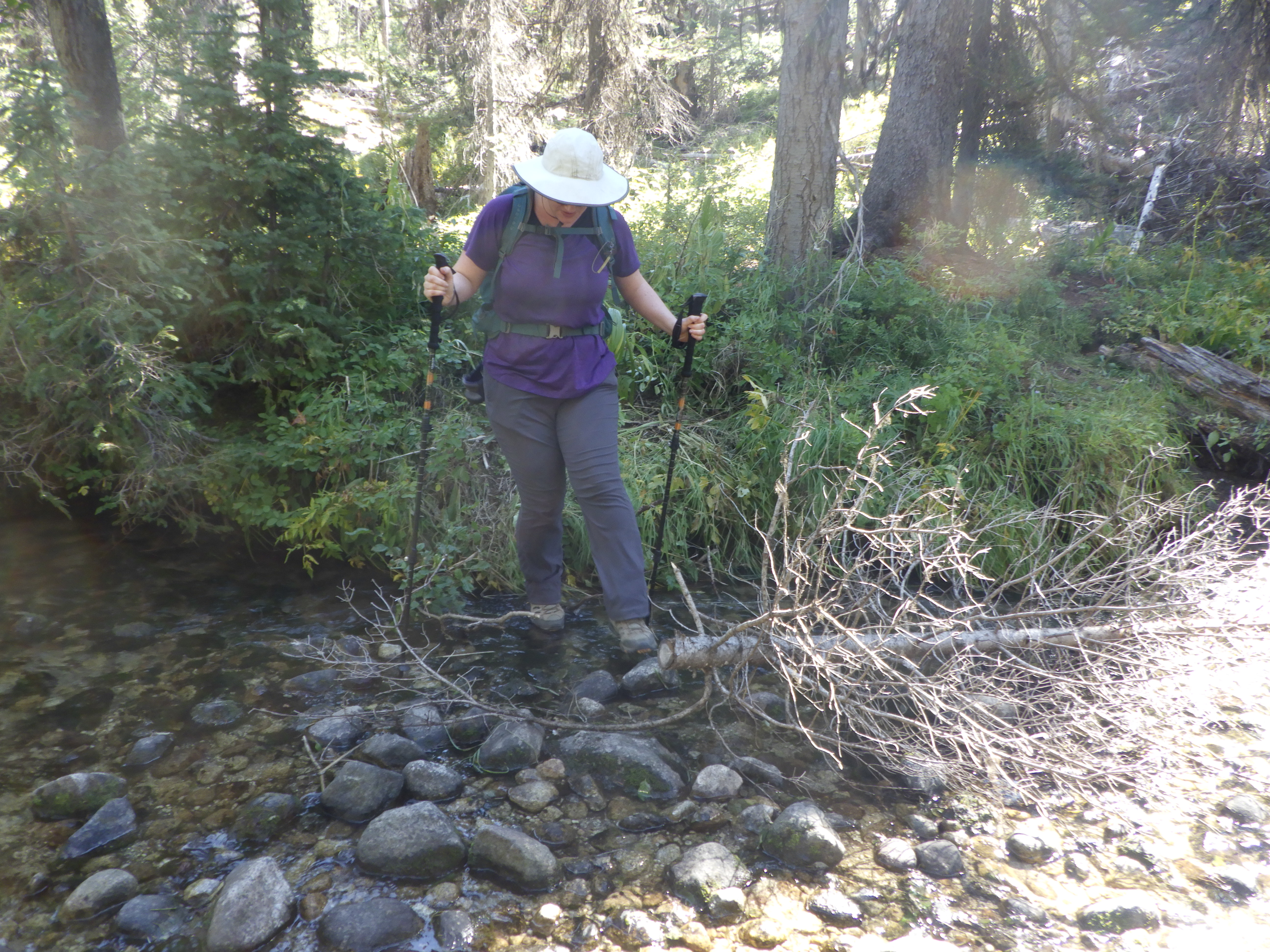 My legs were too short to bridge the gap safely in a step, because the bank was very slippery. So I examined the gap, and saw a submerged rock a couple inches below the surface in the middle of the gap. If I could set one foot down on it just right, I might get my shoe a bit wet, but I’d be able to keep the other foot completely dry. A compromise, but one I was willing to take. Since I was hiking in Altra’s my heel did get wet when I put it on that rock, but not very wet. And when my friend placed her booted foot on it, her sole was robust enough to keep her from getting wet at all (her boots are not waterproof, but they did have thick soles – that started to come off of the uppers on this trip, time for new boots!).