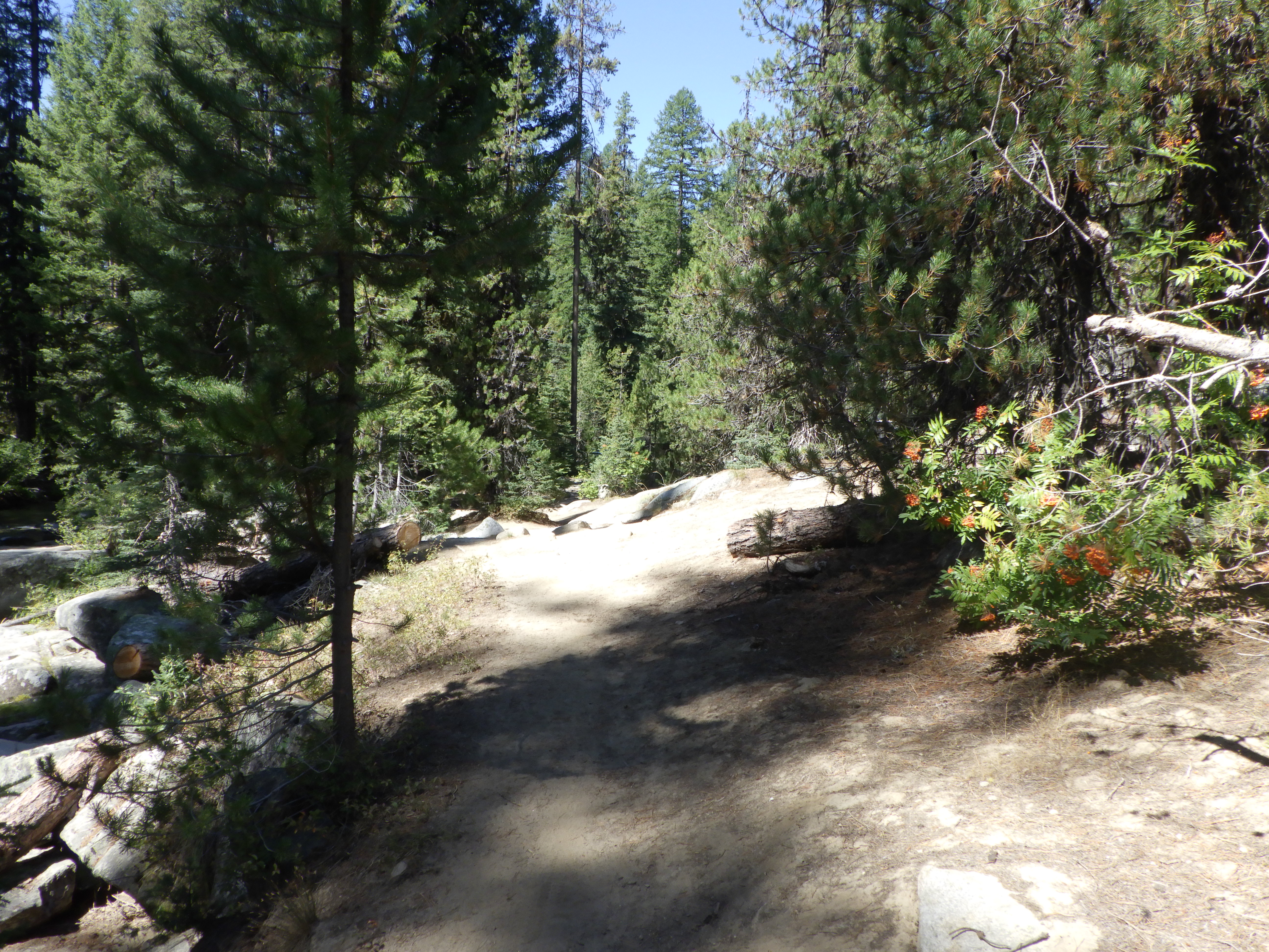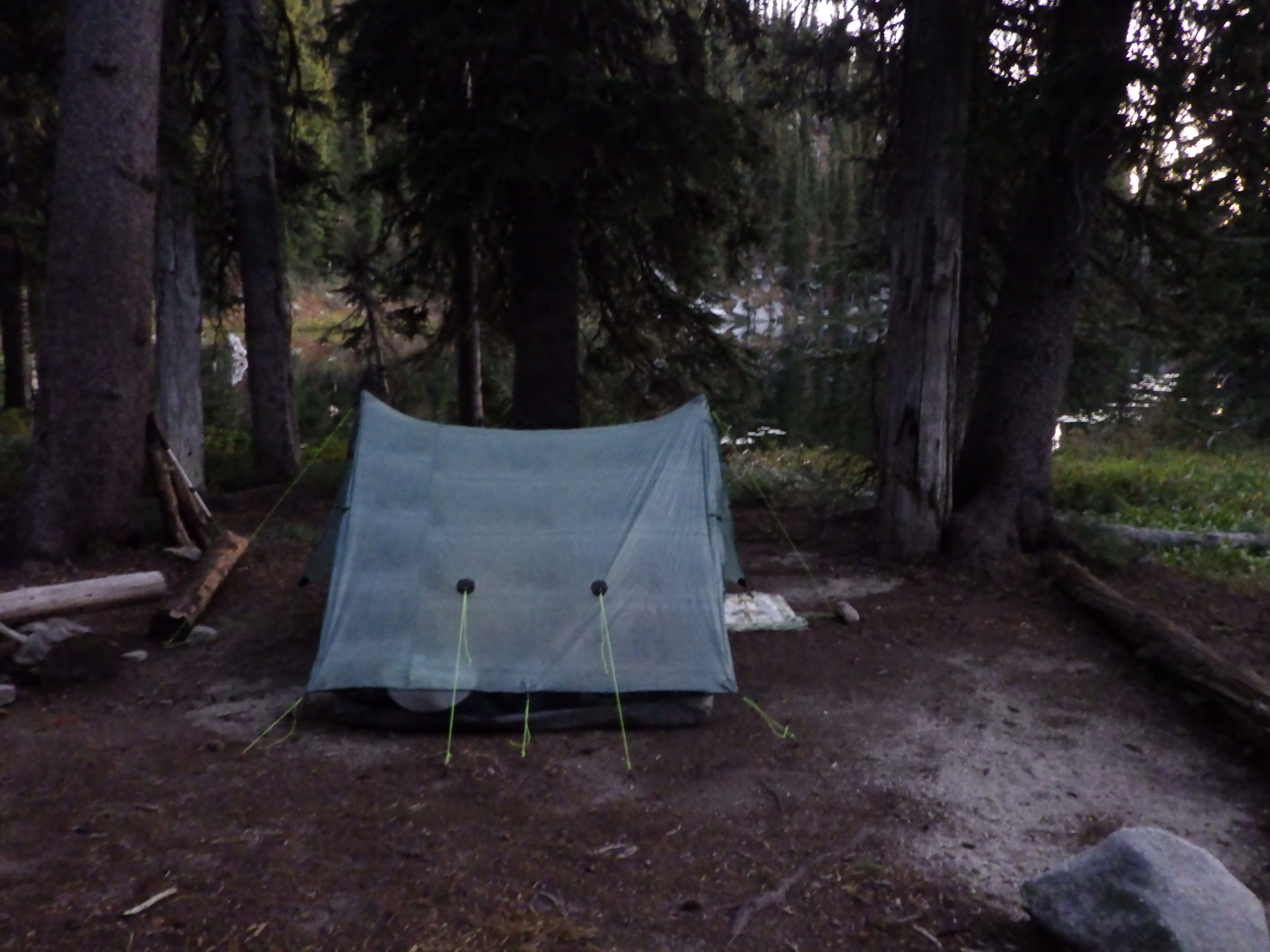 Close to the campground, we saw a guy sitting on a rock in the middle of the creek, looking like he was meditating. And when we came to the campground (just after noon!), we were greeted by barking dogs and the sight of a nearly full campground. I wanted to get to the pit toilet right away, but someone was in it. As soon as that person left, I made a beeline, but I saw she was handing off her TP to someone else and saw a conflict. She offered to rock-paper-scissors with me for the right to next, and I countered with “I just spent 3 days backpacking.”