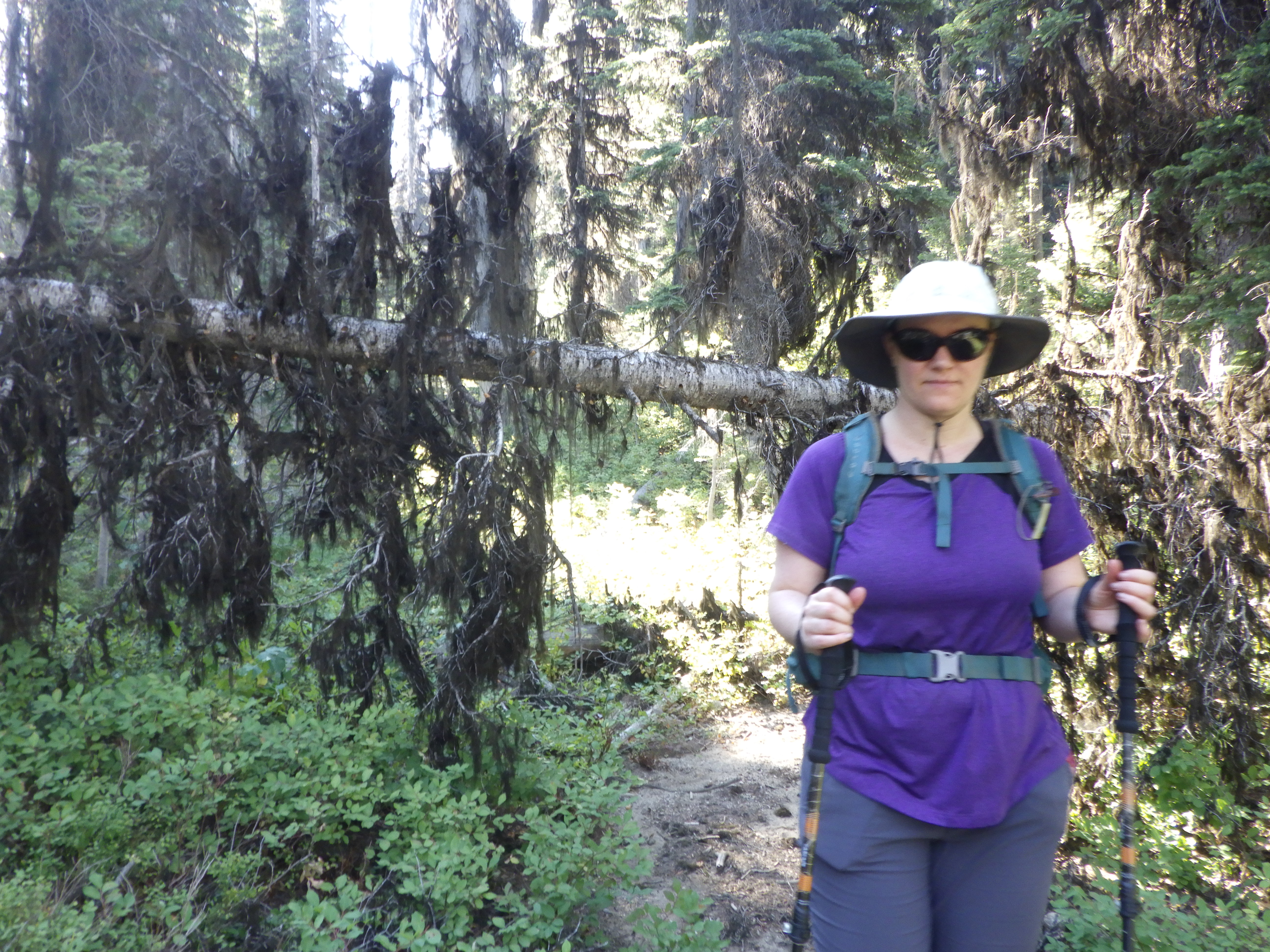 One of these was a little boggy stream crossing that had log options on either side; different sizes and heights from the ground providing different challenges. The other one I recall specifically was a large log, bigger than I could stand over, and covered in rough bark. On the way up, I chose to go over it, even though there was a go-around trail, because the go around went uphill and I didn’t want to climb more than necessary. But on our hike down, we took the go-around, in part because it was painful to get over it, and in part because descending the go-around was easier than ascending it.