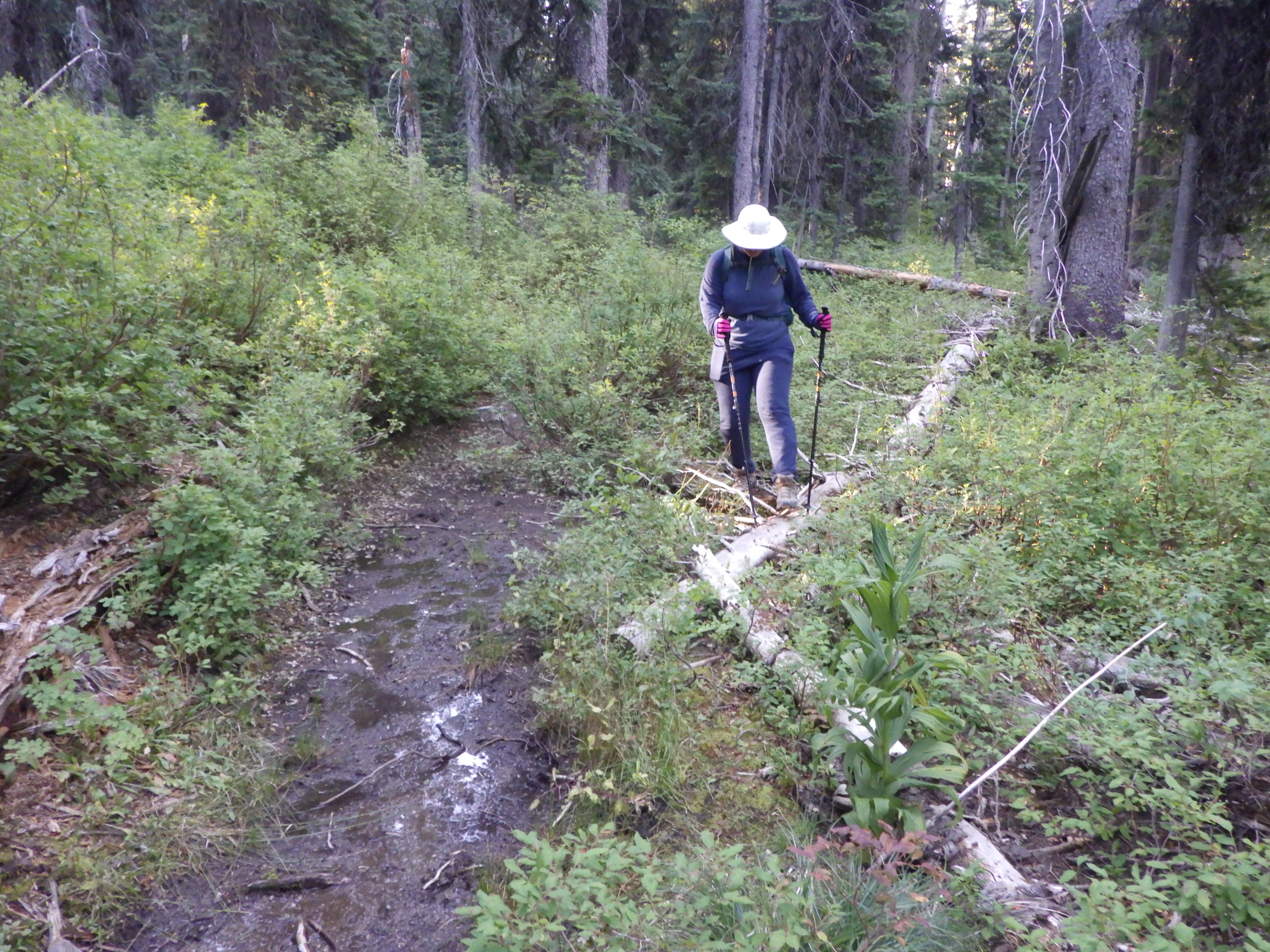 | Crossing the boggy section on the small logs this time. |