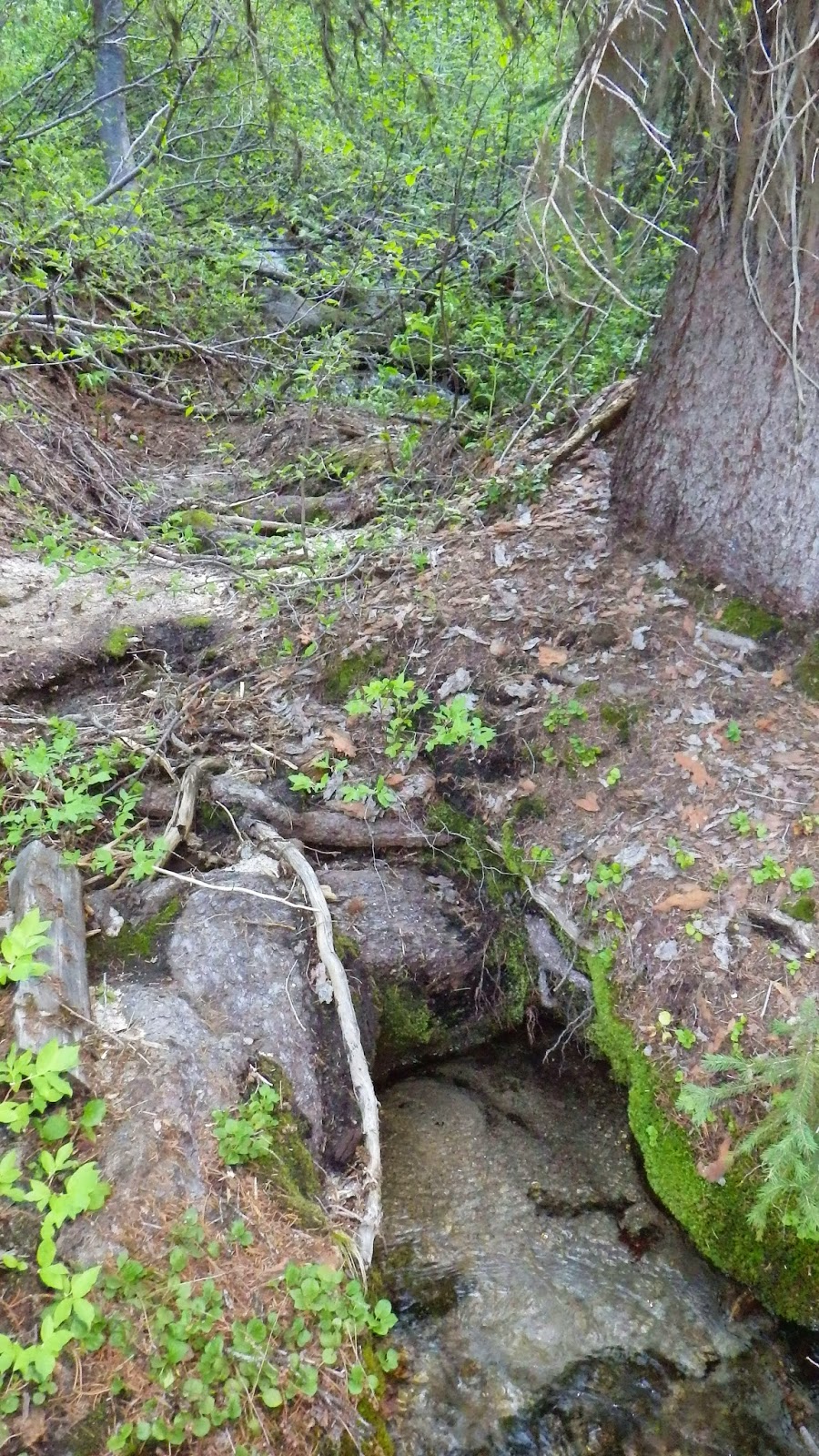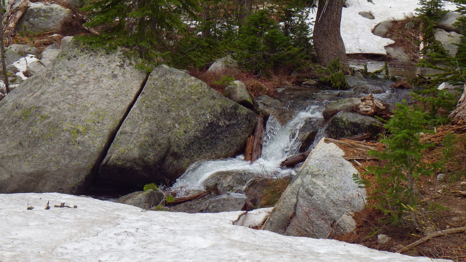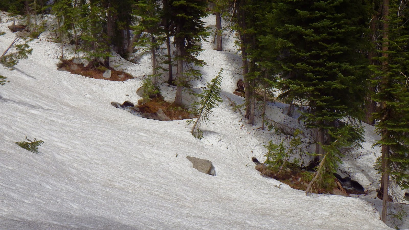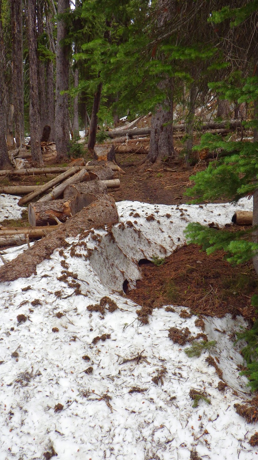 We descended into the the living forest and soon came upon more and more piles of snow. At first, there were just mounds above the trail and to the sides of it. Then the mounds got larger. Soon the snow was more predominant than the dirt. Snow melt streams flowed underneath sections of the snow-covered trail, making the crossings deceptively treacherous.