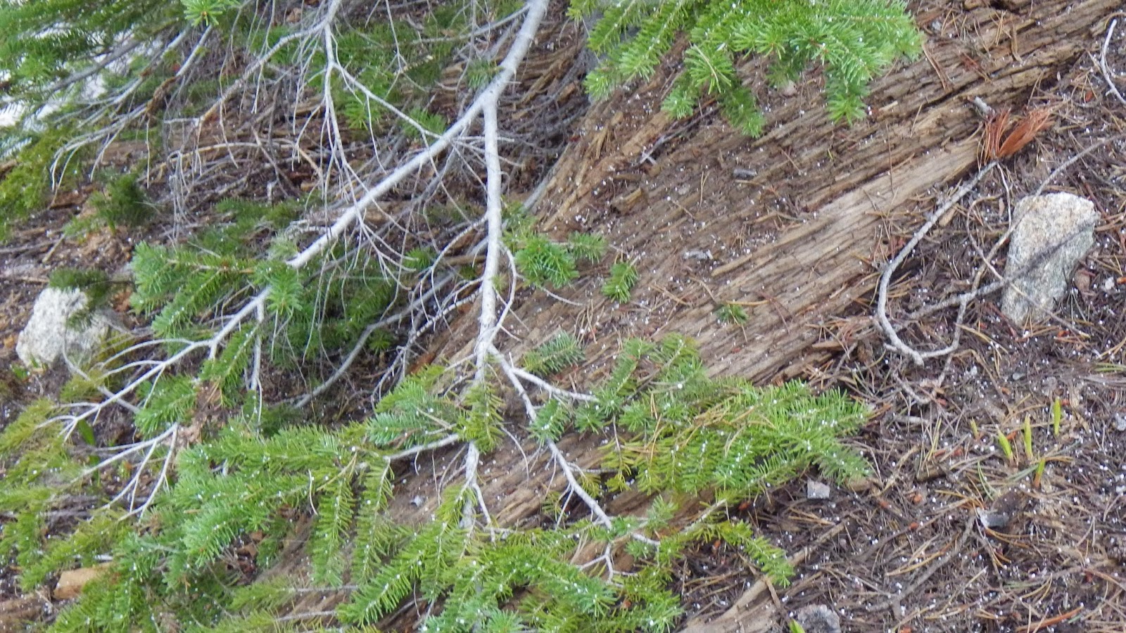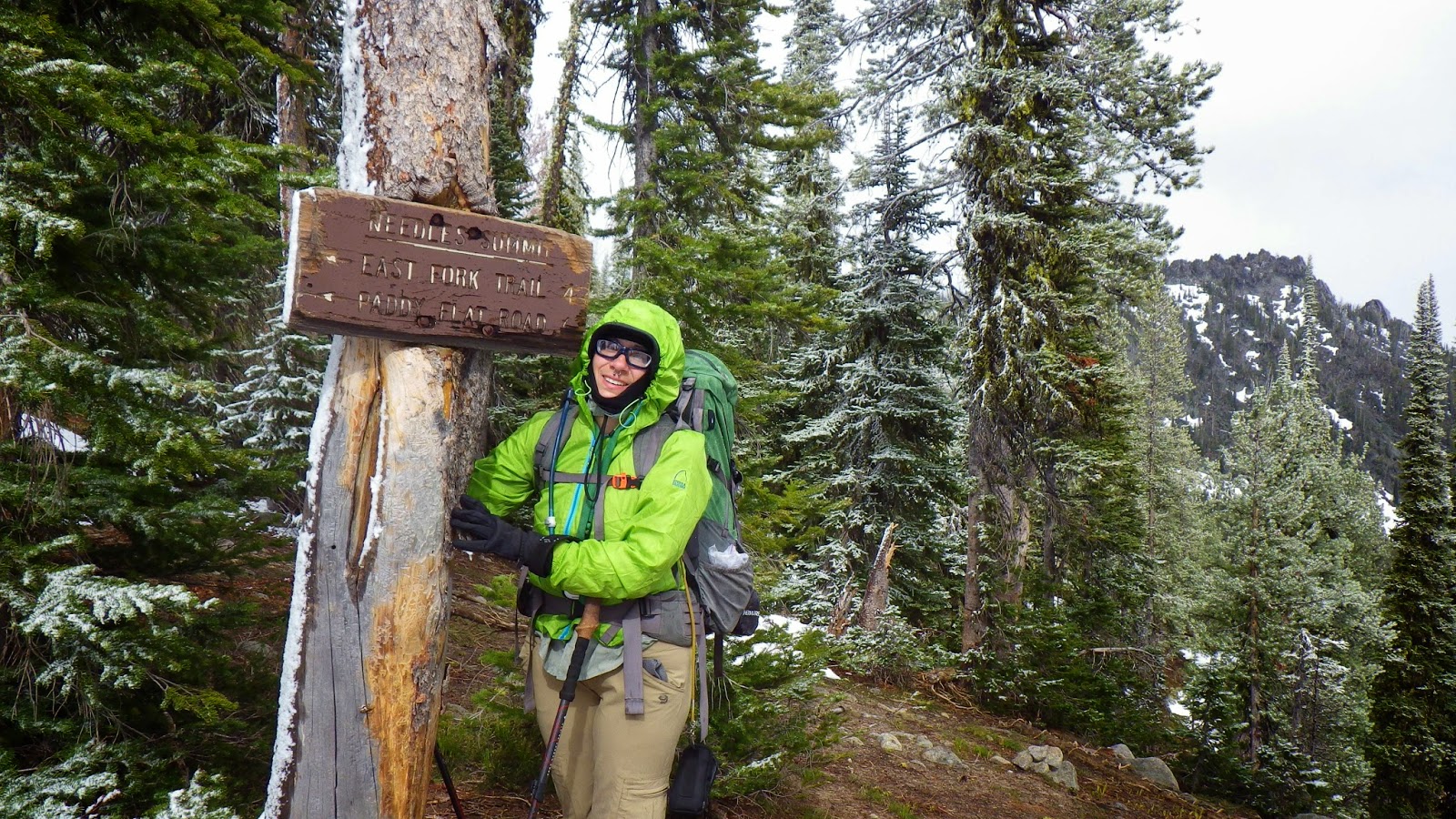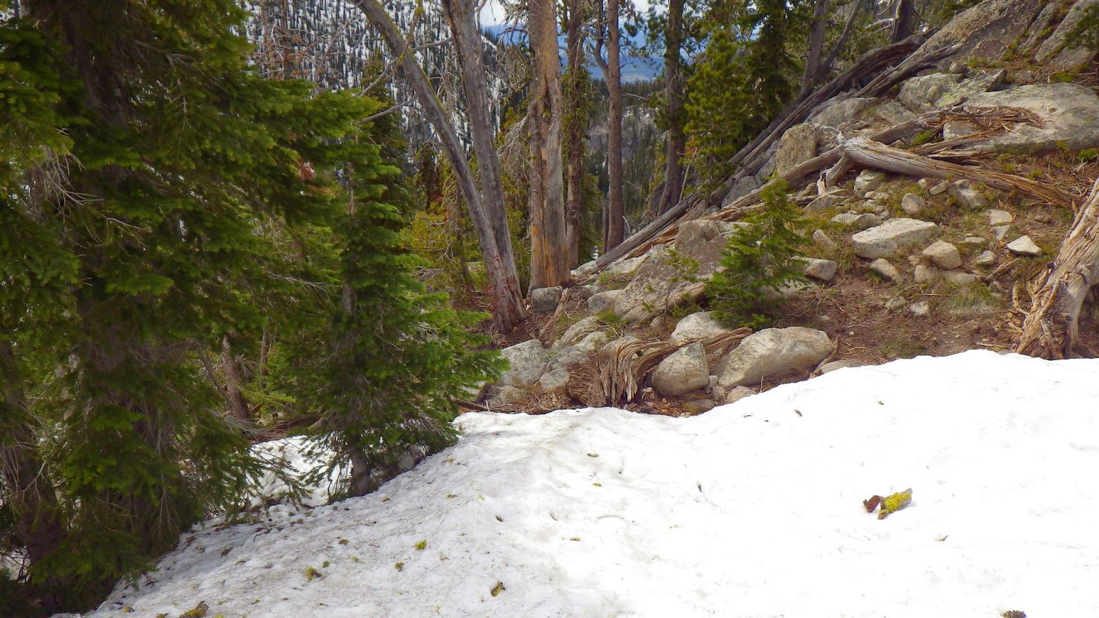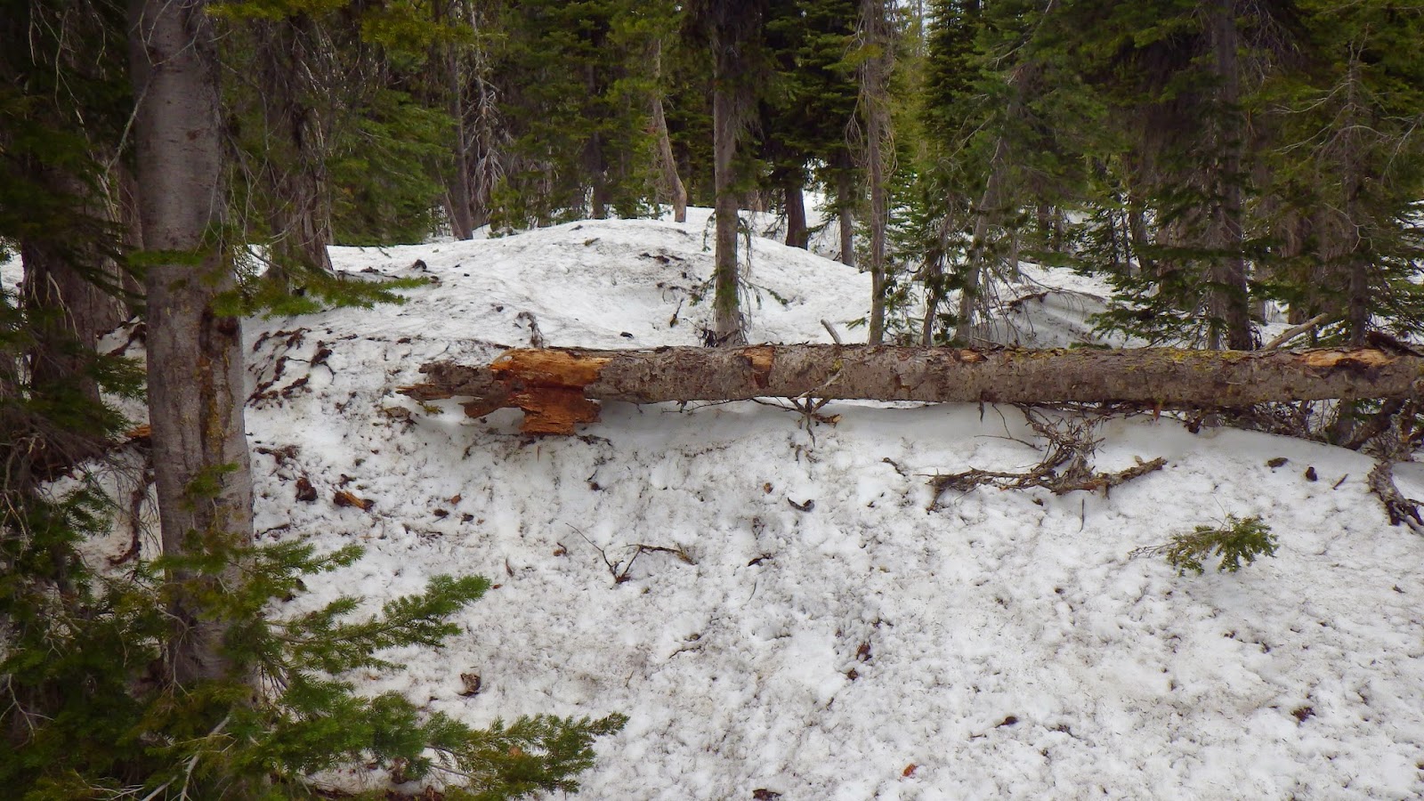 As I approached the trail junction where I would turn on to the Needles pack trail, the snow gradually disappeared. I had to detour around a huge treefall to get to the fire camp, but since that area lacks brush, it wasn’t a big deal to walk around it. I moved past the saddle to try and hide from the wind before sitting on the ground and eating a snack while I waited for Ambrose to catch up.