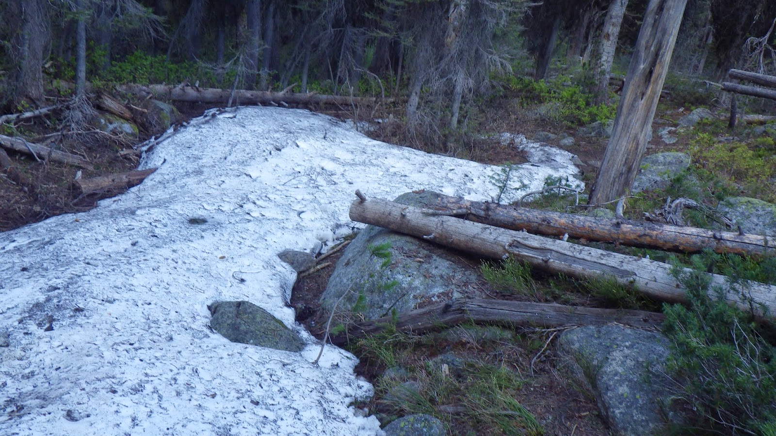 At a steep uphill section that followed the Gold Fork River, the snow became less prominent again, but my relief at that respite was short-lived. Once we hit the top of that section, snow was everywhere.