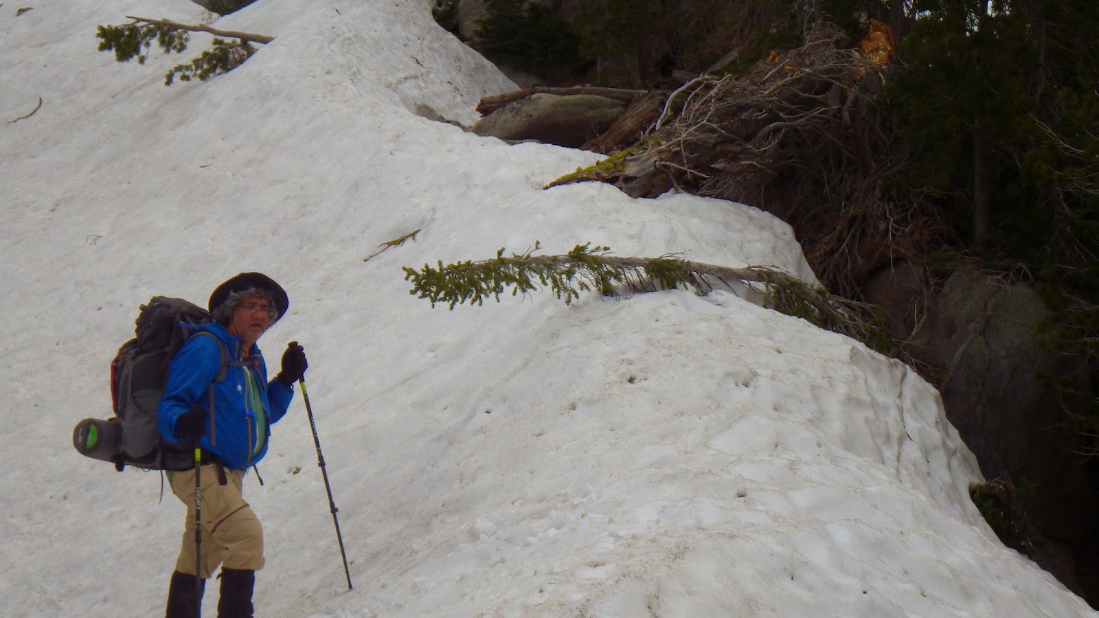 I’m not sure why we never talked about going back. I think we both felt that we knew the trail well enough to keep going despite the snow, and that we both had this hope that it would get better. There might also have been a hint of macho behavior. We wanted to prove to ourselves that we could handle this. Snow travel is a lot harder than travel on dirt. It’s like walking in sand, only sand doesn’t usually have random sinkholes.