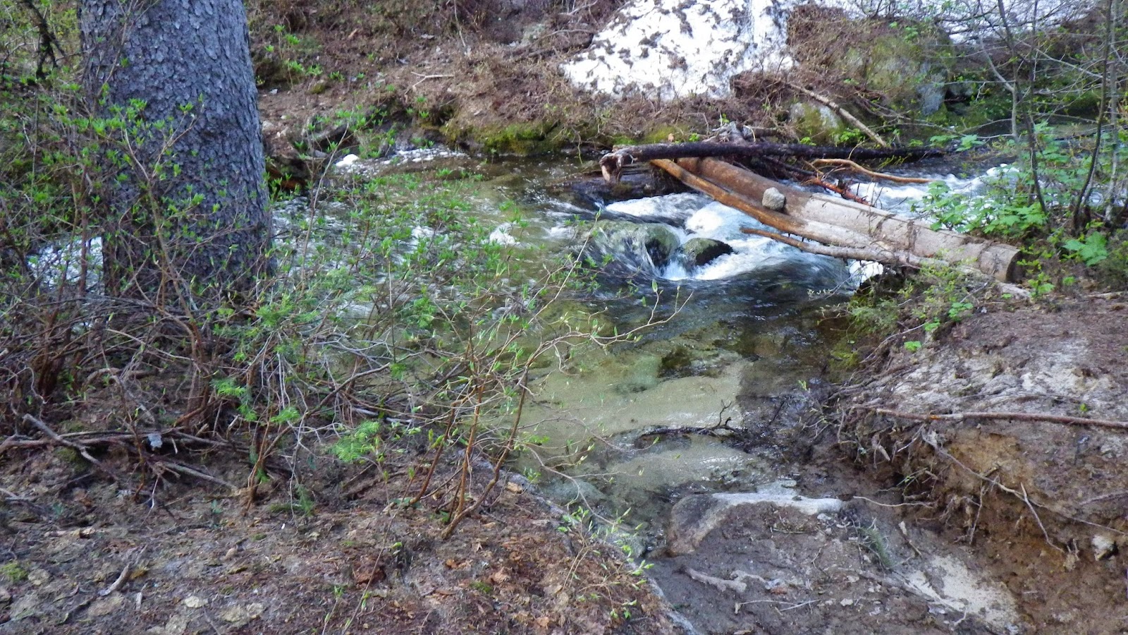 | Yes, we crossed this swollen stream on those two wet logs. |