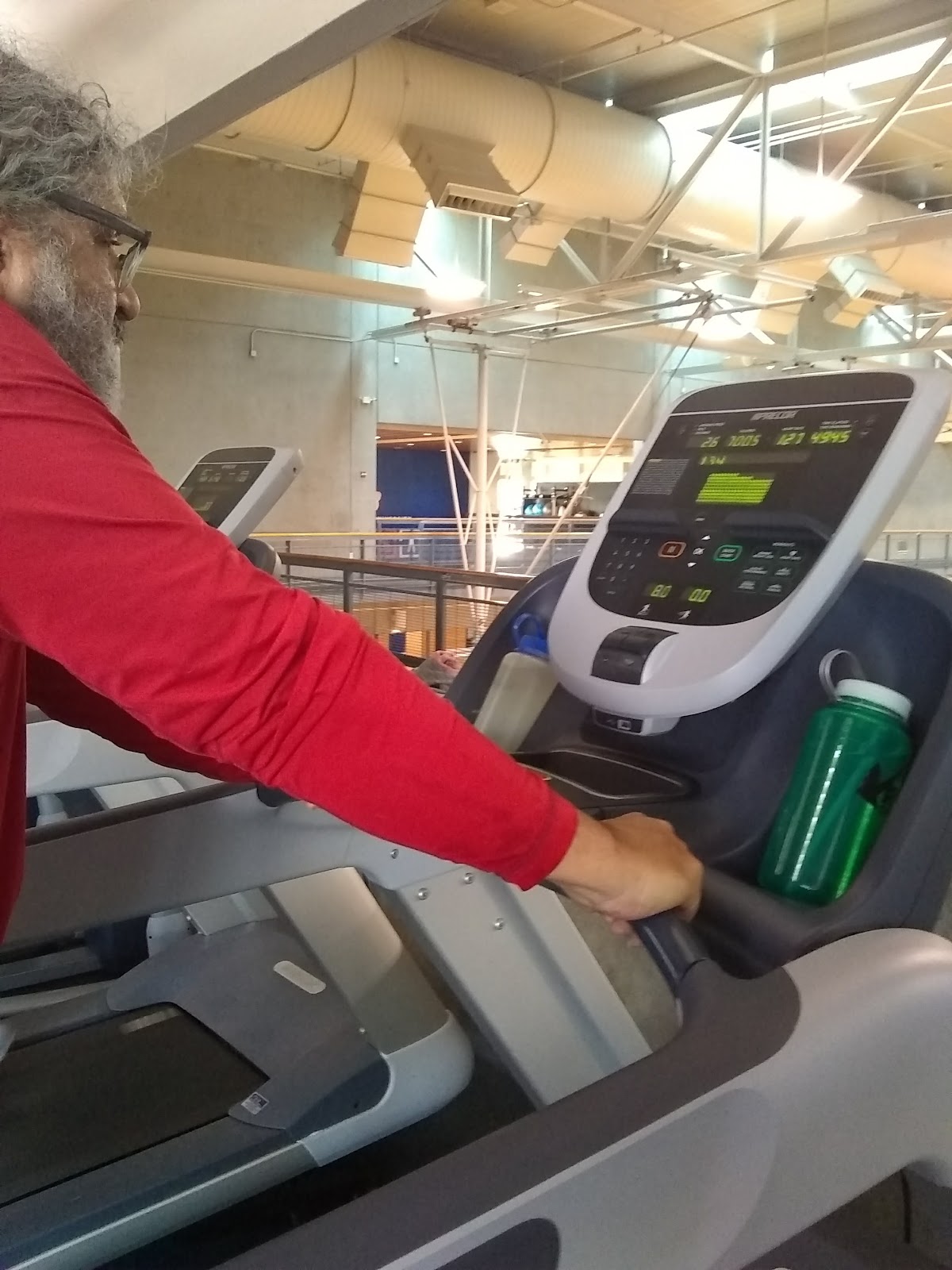 He has challenged himself to walk on a treadmill and burn a set amount of calories in under an hour. The first goal was 700 calories in under an hour and he has been hitting that for a while now. But last Saturday was his first sub-50 minute 700 calories, and I happened to be on hand to record the moment.