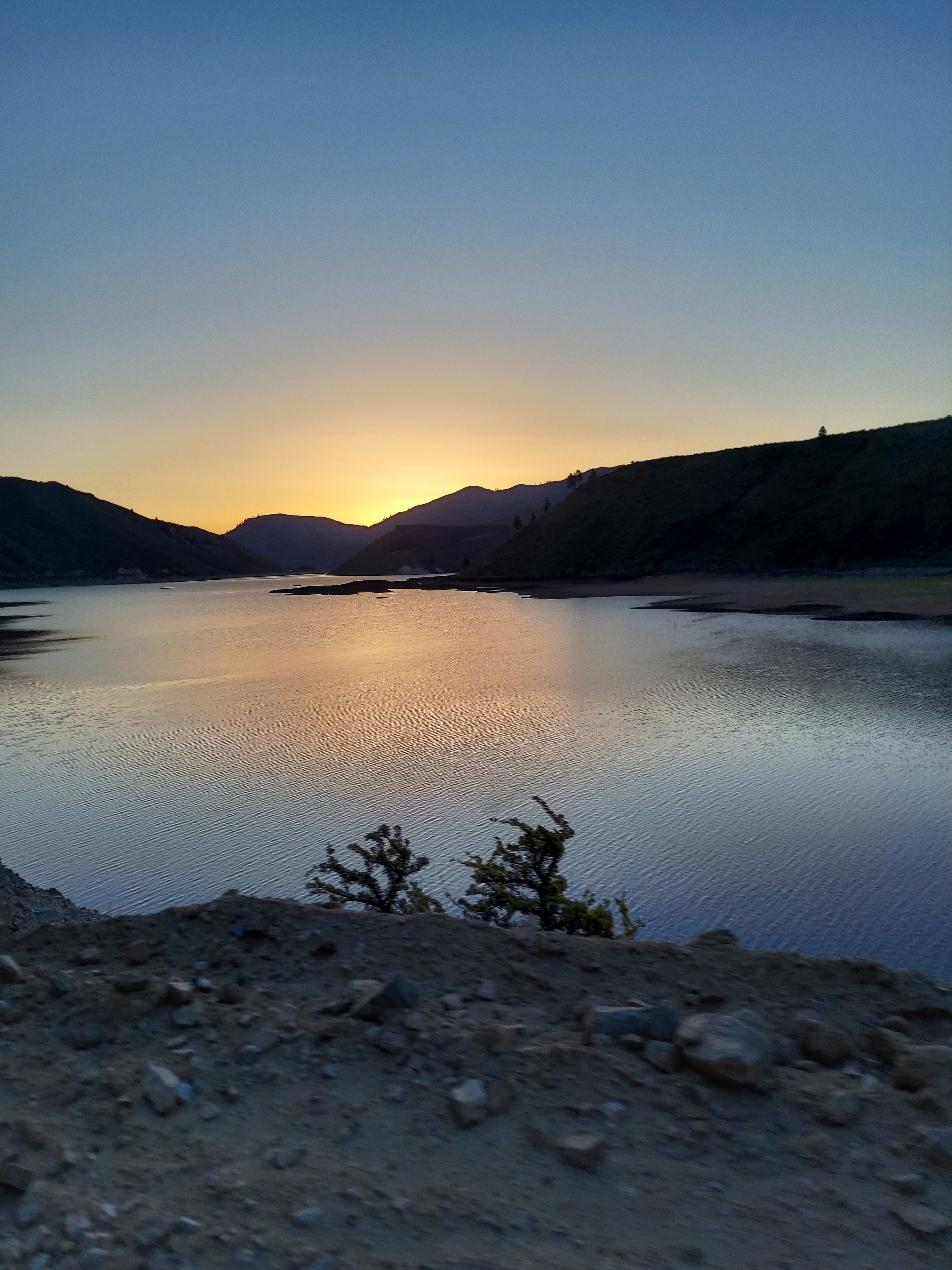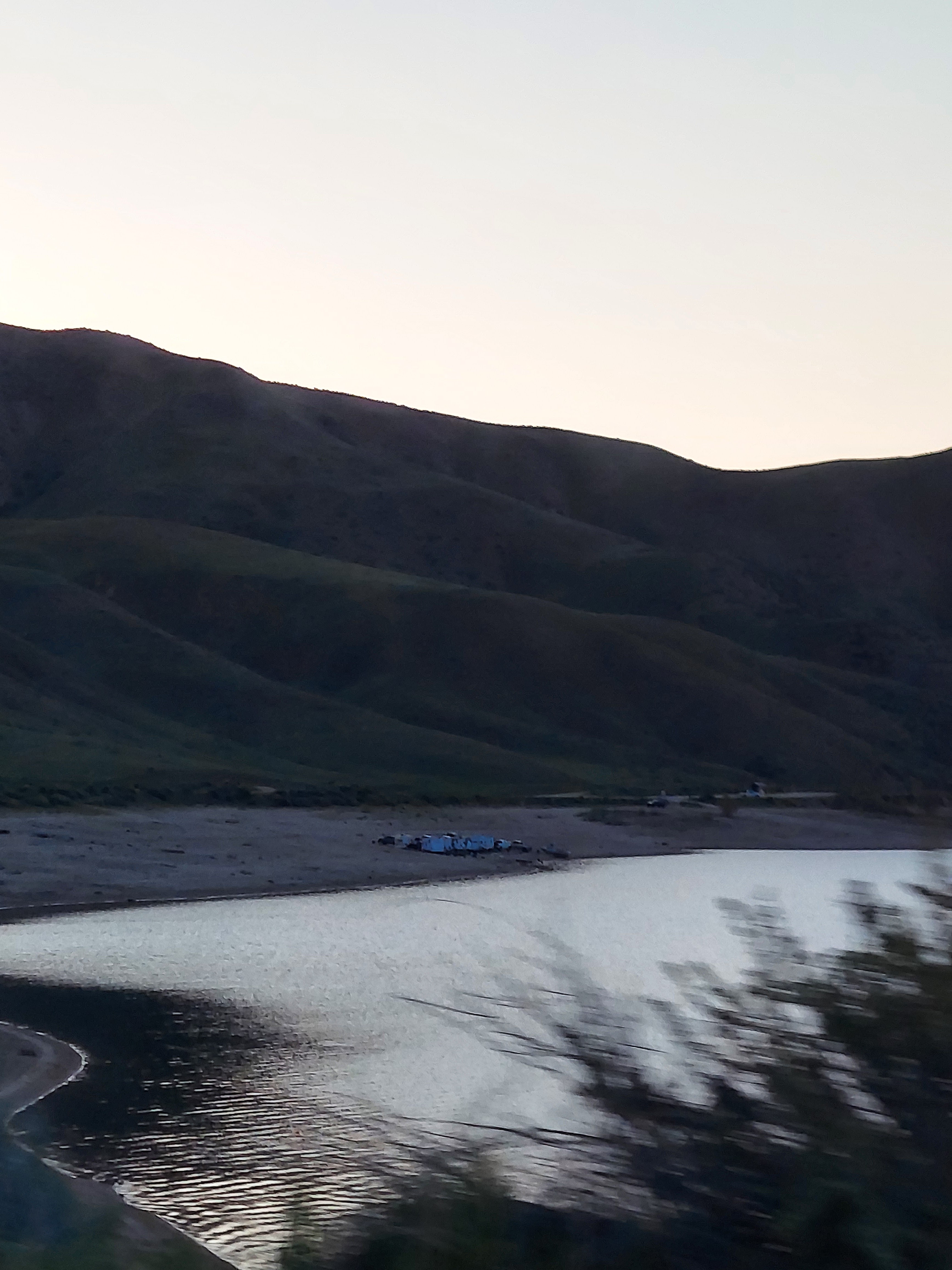 I dragged the old down blanket out of the car and put it on my camp chair so I could both sit on it and wrap it over myself. I was wearing fleece pants and a down jacket, but without moving around, it got really cold. And the down blanket also helped protect me from the wind. I spent most of the not quite 3 hours before Ambrose came back sitting on the chair, variously facing the sun or the water, and thinking.