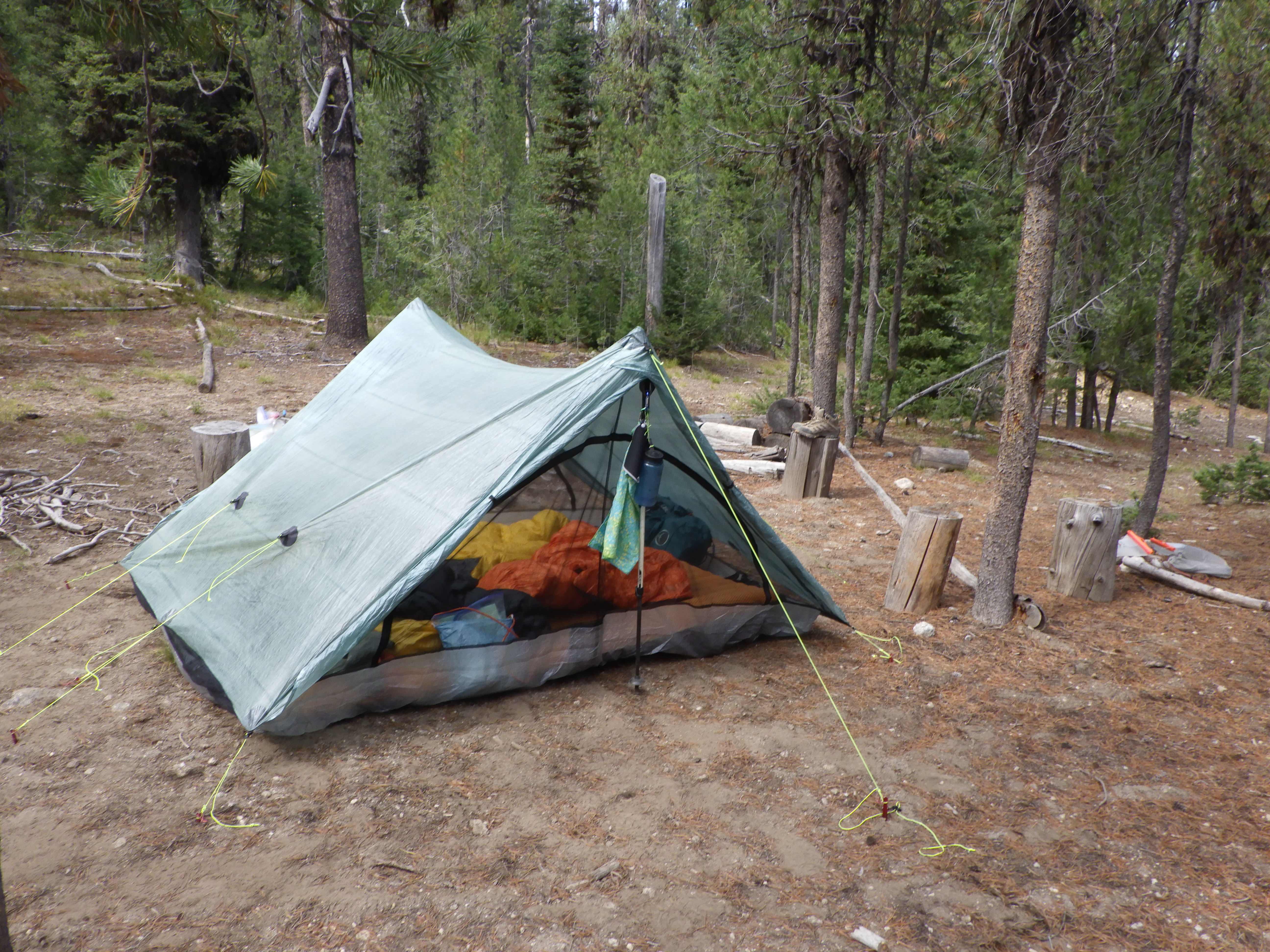 Back at the campsite, we did camp chores. We picked a spot for the tent and got it erected. I showed her what direction to go if a hole needed to be dug. We looked around for trees to secure our food bags; I had an Ursack, which requires a medium sized trunk to be tied around while she had a standard bag that we needed to hang.