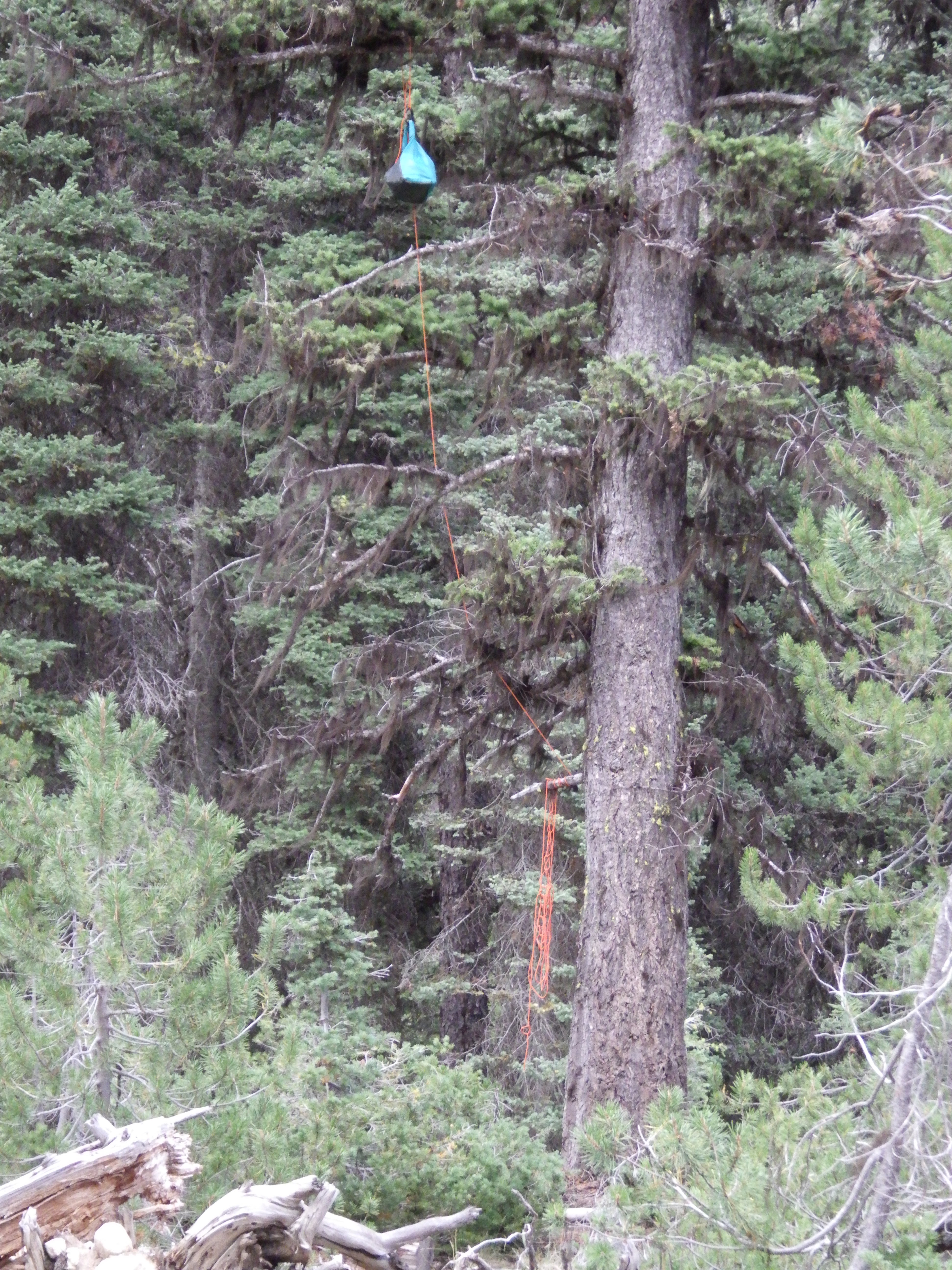 The Ursack didn’t take too long, because trees like that are not exactly in short supply in that area. Finding a decent branch to hang from took a bit longer, because most of the trees in the area have branches that slope downward at a fairly sharp angle. It would be hard to hang something from them even if they weren’t so close to their trunks. Ideally, the bag is hung 10 feet high and 10 feet out from the branch’s trunk. In practice, I go for 10 feet high and as far from a trunk as I can manage.