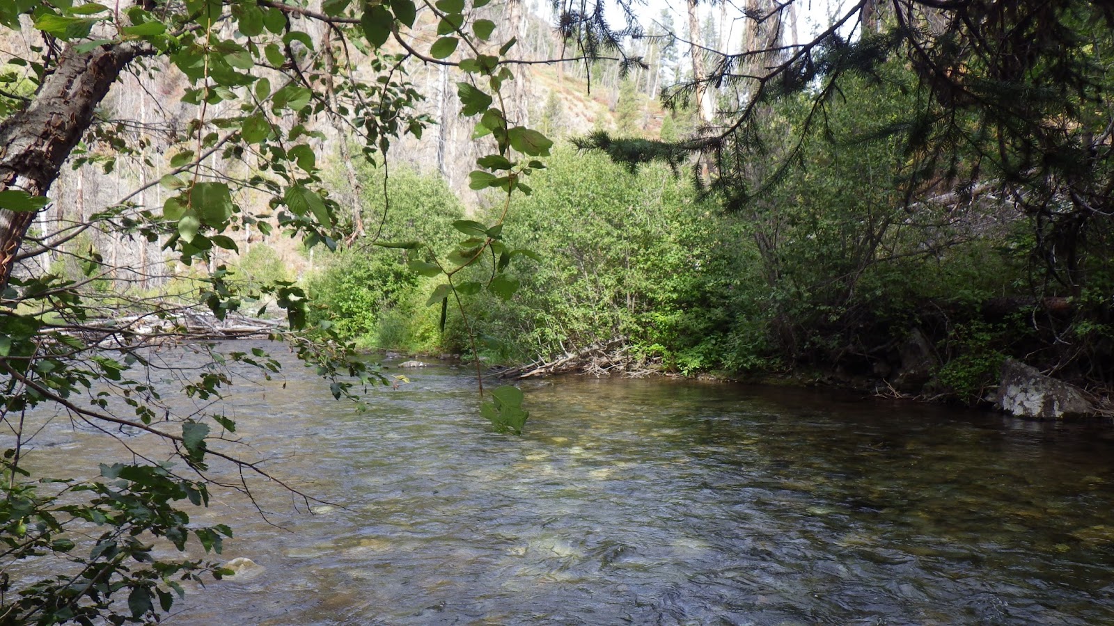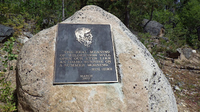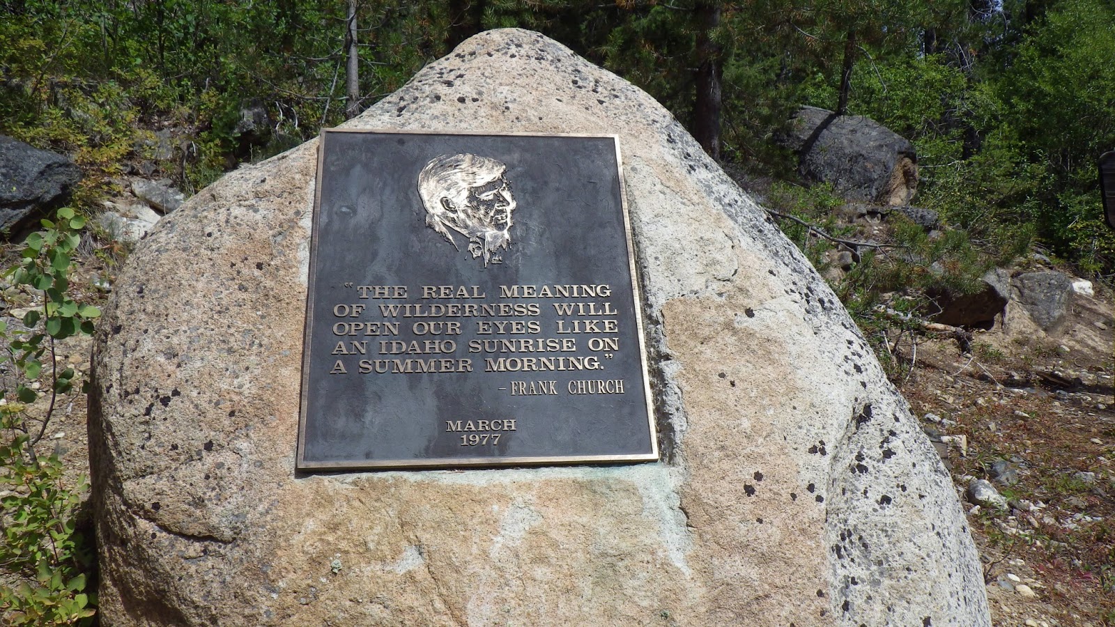 The road led down to a bridge crossing what was labeled as Smith Creek, though our maps called it Big Creek. And then we saw the Big Creek trailhead. It had no parking area, but it did have a place to register and a monument to Frank Church. According to our guidebook, the trail we were about to hike used to be a road.