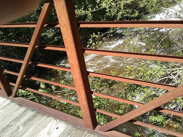 I had to go slow once I reached the junction down to the bridge because that trail is just covered in softball sized rocks, waiting to reach out and roll my ankle. The creek was flowing so high and fast that I was concerned that the bridge might not be above water. But I had forgotten how high it sits above the creek. When I got there, I saw it was in fine shape, and the campsite looked to be ready for us to come for an overnighter.