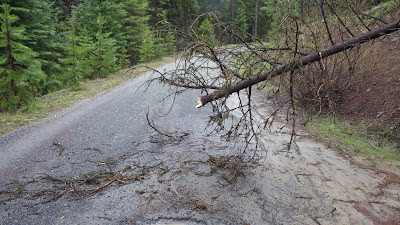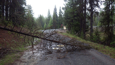 We almost had a problem leaving the campsite. See, it had rained pretty hard overnight. The road was muddy, and one of the trees above the road had decided it was just too slippery to hang on. It fell all the way across the road, blocking the exit in sight of the highway. I got out to assess the situation, see if I could maybe drag the thing around enough for us to pass. When I grabbed onto the end of the tree and began to pull, it surprised me by breaking off about halfway across the road – just enough room for us to pass. Ambrose didn’t have to (get to?) bring out the hand ax.