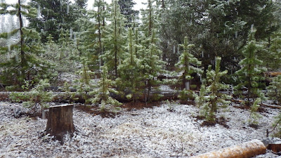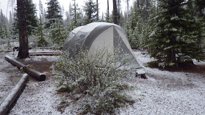 The rain turned to snow. Wet snow. Heavy. It weighted down the roof of the rainfly, pressing it against the mesh roof. Still, we were content to stay and watch the pretty flakes falling. Until Ambrose went outside to relieve himself. When he came back to the tent, he slipped and fell on the bird seed bag I had put out as a door mat. I went out next, using my umbrella for protection from the snow, and when I got back, he insisted that it was time to leave.