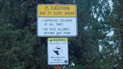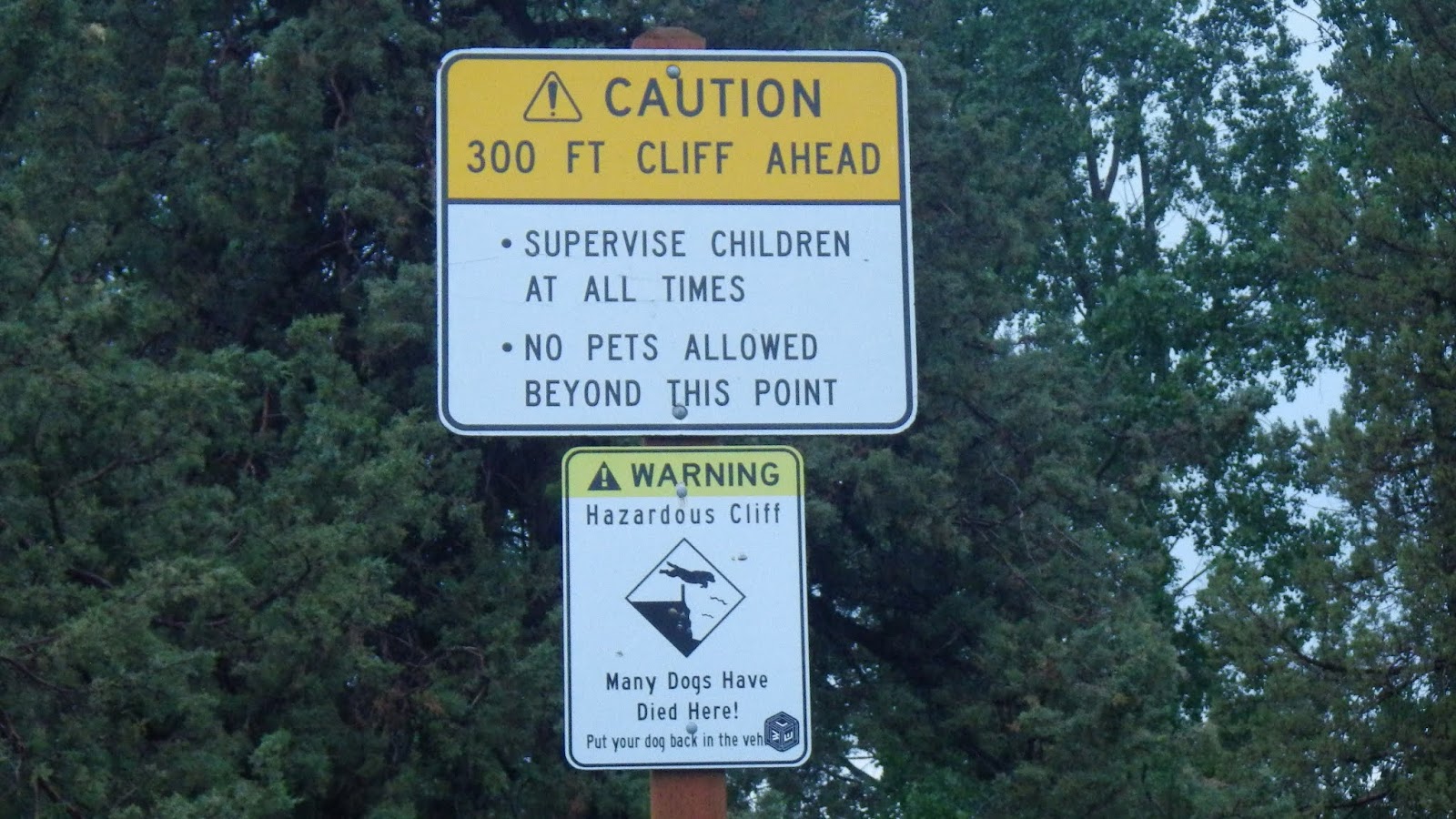 The rest stop had several other cars and trucks in occupancy. I had a decent sleep, but my body felt all sore and achy from the contortions involved – ideally, I’d sleep stretched out in the back seat, but the car was too full of stuff for that, so both of us were in the front, half sitting and wrapped in our down quilts for warmth. I will say I was not cold. The rest stop also was apparently home to a cliff, with quite an interesting warning sign for dog owners.