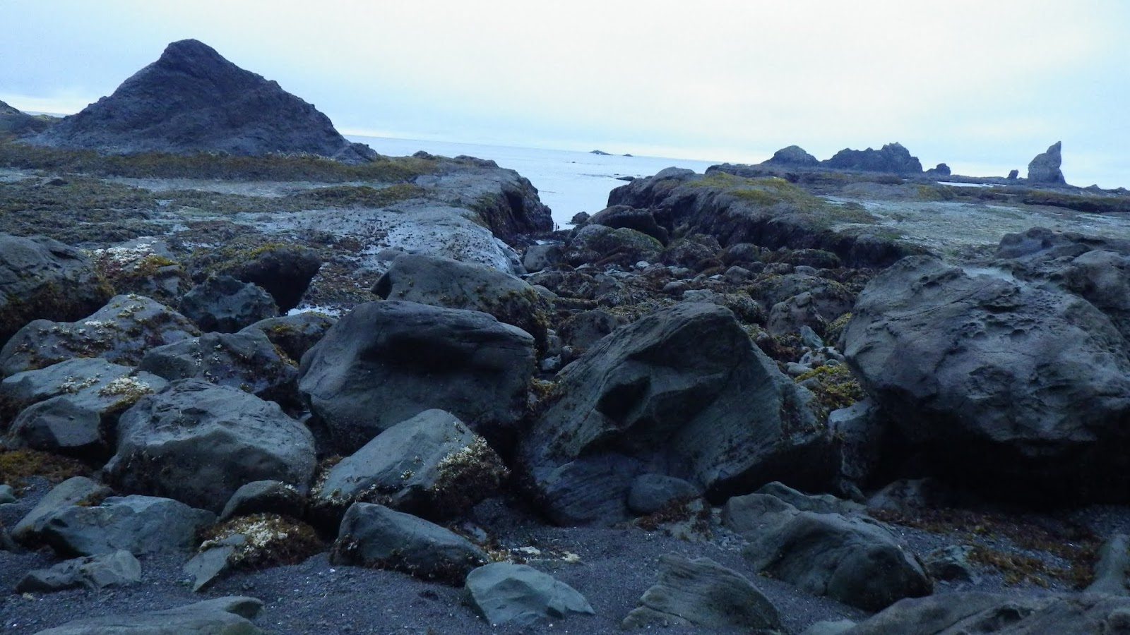 We got up at 4 am to start the second day to try and maximize our travel time around low tide. That was maybe a little too early, especially on an overcast day. Bill got his first taste of hiking over rocky coast, including areas where the options for footing were slick, wet rocks or seaweed covered, wet rocks.