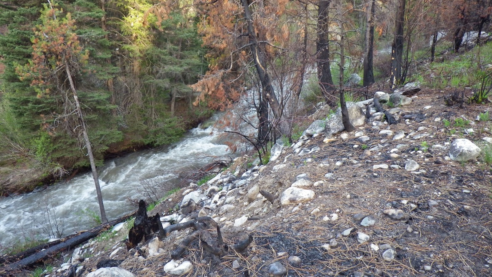 The next tributary crossing involved a dry log, but it had some complexities to it. The end lodged on the far bank was sheared off so that the last portion of the crossing was on an edge about two inches wide. And the bank was crumbly with ash, because there had been some fire damage. As fun as it was crossing in that direction, I was not looking forward to the return trip when we would have to start with the edge portion. The sun was beginning to climb over the canyon wall as we hiked on. According to the map, there would be another crossing of the Little Queen’s River, and based on the flow, I knew we would likely have to turn back if there was no bridge (or log that could be used as one). The trail turned, and we easily crossed a shallow tributary before coming to the end of the day’s journey.