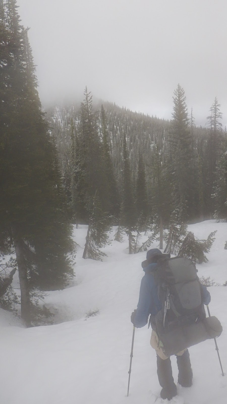 As we lost elevation, the snow became more melty – at least on the surface. It was still deep enough to support our weight over a stream crossing or two. Ambrose had a few falls, but nothing that caused injury, just inconvenience. Getting up on melty snow is not easy, especially when you’ve got a pack on your back. And the pack has a wet tent inside. And you’re cold!