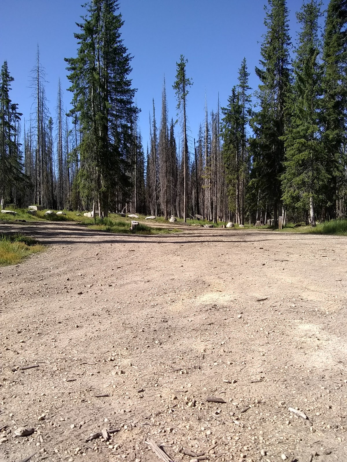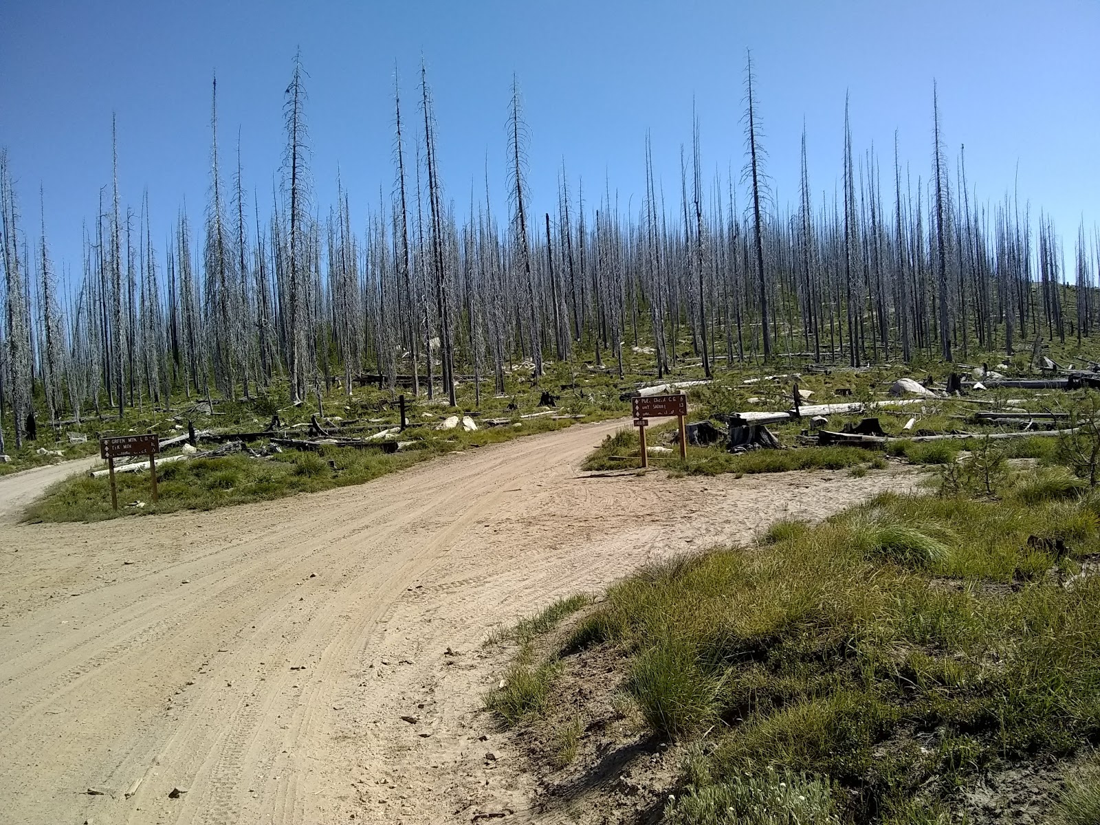 | The Elk Creek Road junction at the start of a large burned out area. |