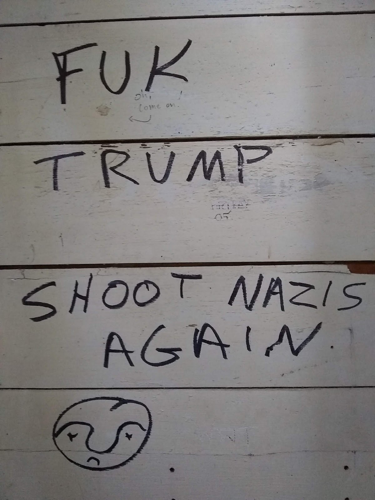 | Graffiti on the inside of the privy at Poet Creek. |